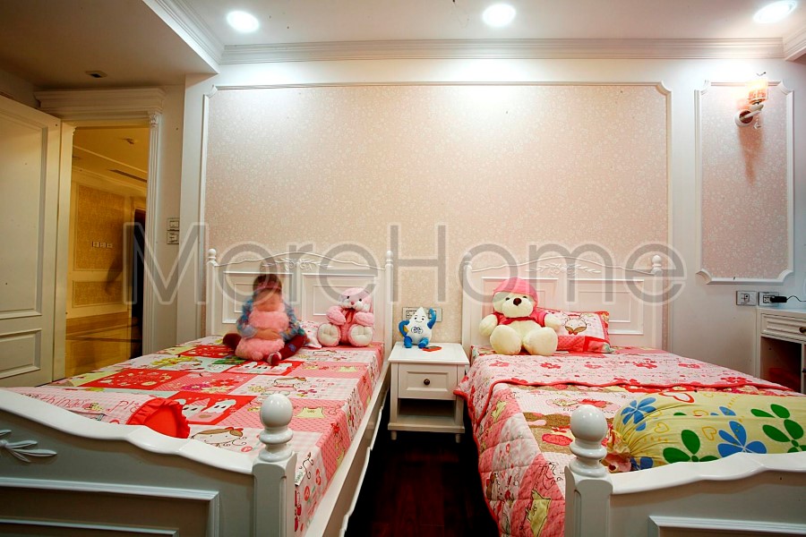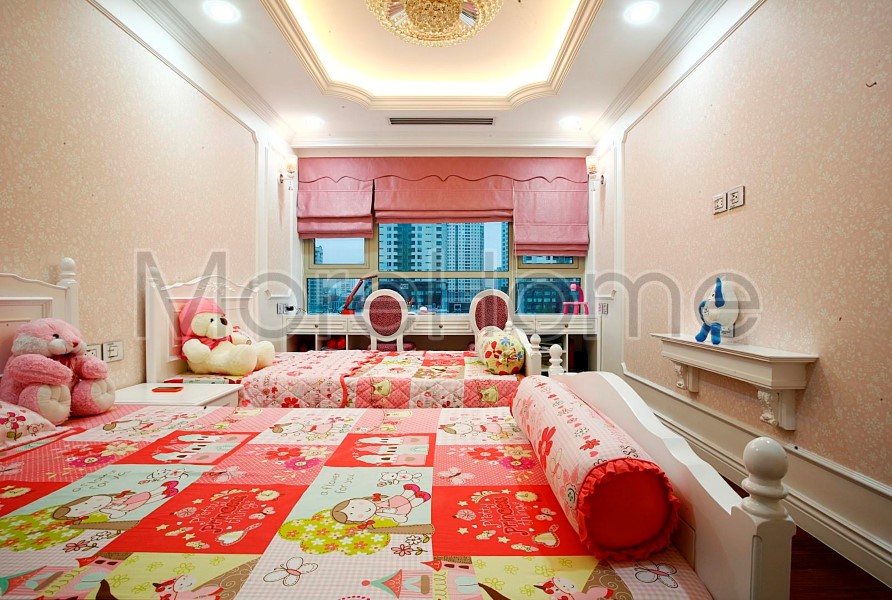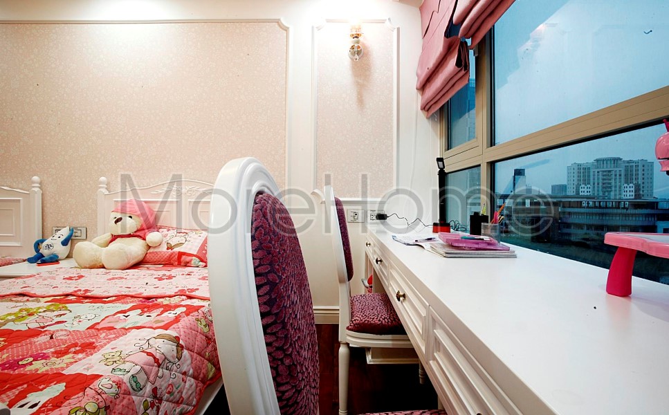 Thiết kế phòng ngủ của chị em gái được ưu ái chọn tông hồng làm màu chủ đạo giúp căn phòng mềm mại nữ tính nhưng vẫn có nét cổ điển hòa hợp với thiết kế tân cổ điển – thiết kế chung của căn nhà ở việc chọn ghết và những chi tiết tạo hình tường, đèn… Lựa họn bàn học hướng ra ngoài cửa sổ cũng giúp bé có những giây phút thoải mái thư thái ngay khi học bài.