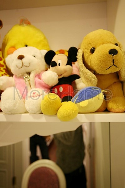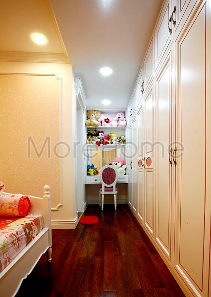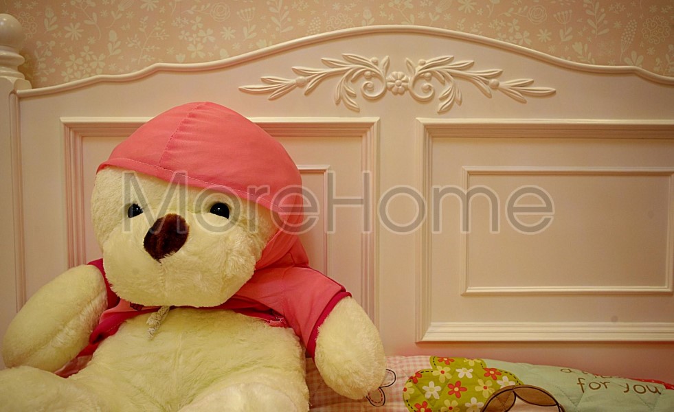Thiết kế tủ âm tường màu trắng giúp căn phòng không bị bó hẹp vào một không gian đồng thời bàn trang điểm cũng như để gấu bông của bé được khéo léo đặt vào khoảng không gian thừa của căn phòng cạnh cửa ra vào vừa tận dụng không gian lại vừa hợp phong thủy.