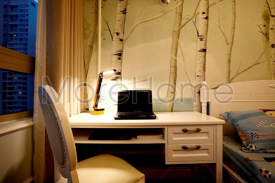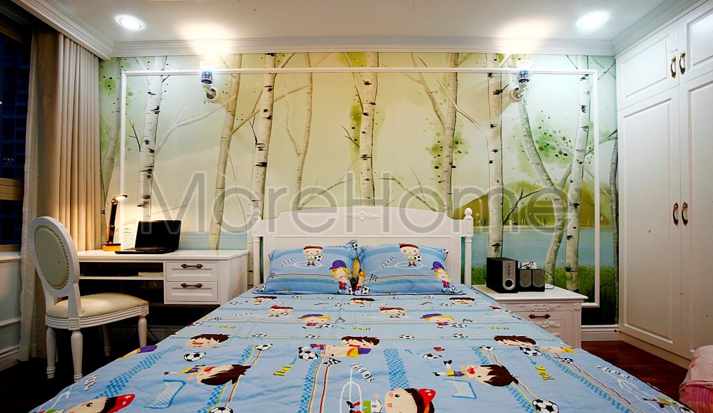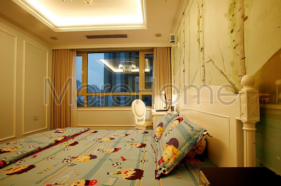 Thiết kế phòng ngủ bé trai nhấn chủ yếu vào tông xanh tạo cảm giác mát mẻ và thanh lịch song vẫn ưu tiên các chi tiết giường, ghế, bàn học để đồng nhất với tổng thể thiết kế tân cổ điển của toàn bộ căn nhà. Cũng giống như phòng ngủ bé gái, phòng ngủ bé trai cũng được thiết kế tủ âm tường giúp nới rộng không gian vừa để tạo một chiếc tủ vừa giúp căn phòng thoáng đãng, không mang lại cảm giác bí.