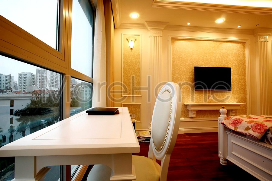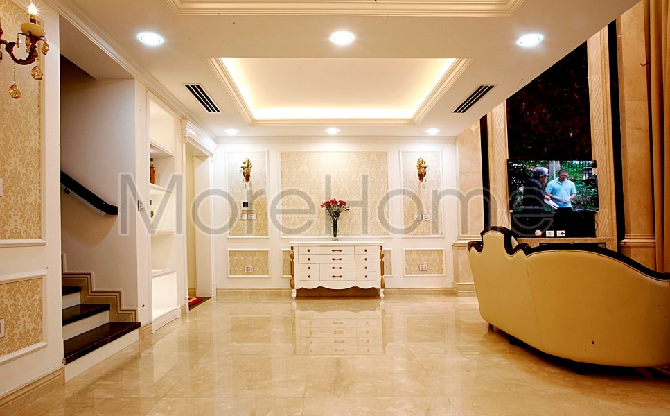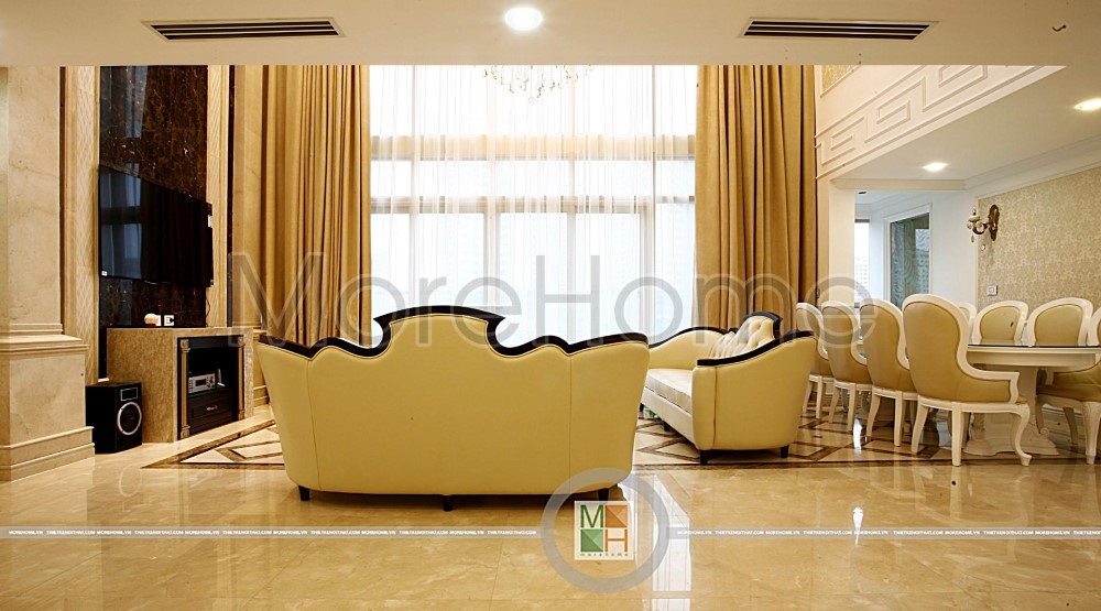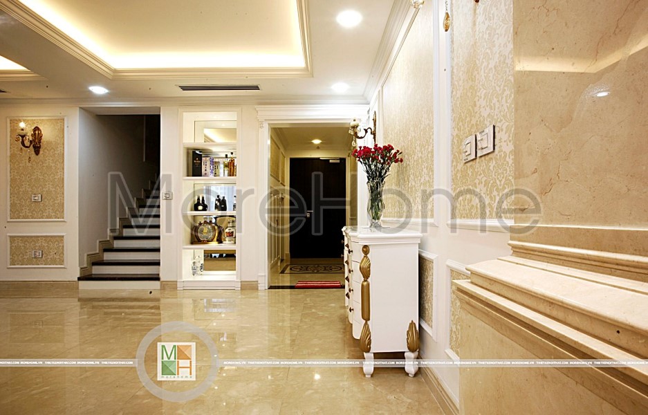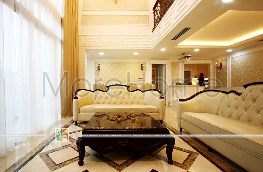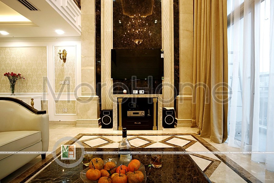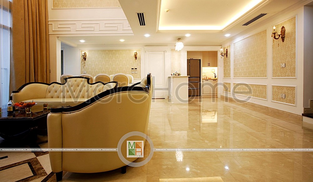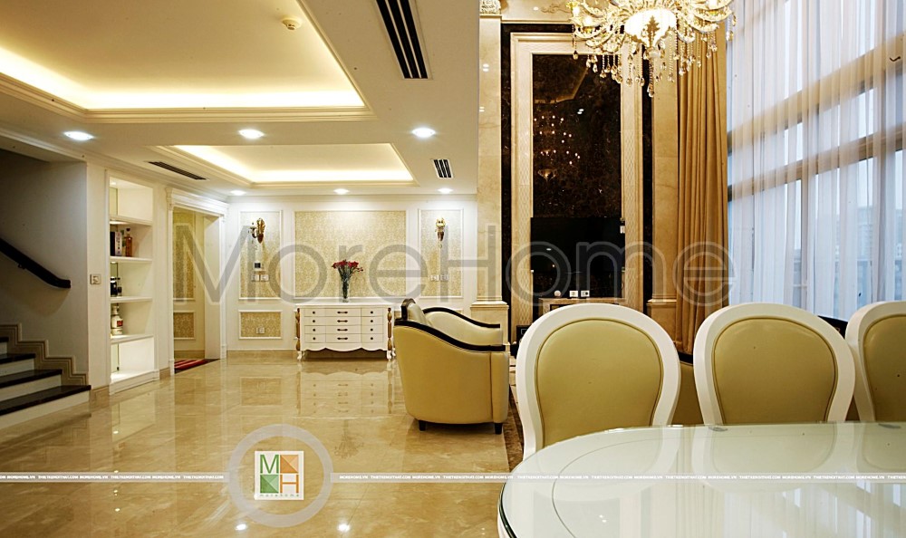 Thi công nội thất chung cư tại Mandarin với tất cả các hạng mục. Bắt đầu từ sàn nhà được lát đá cẩm thanh càng làm thêm phần sang trọng cho căn nhà. Chi tiết ghế sofa cùng bàn nước tạo vẻ ấn tượng, không bị nặng nề vào các chi tiết lấy tiếng mà vẫn trang trọng. Chiếc đèn chùm gần như là một phụ kiện không thể thiếu trong kiến trúc cổ điển, giúp cho căn phòng toát lên vẻ sang trọng đài các.