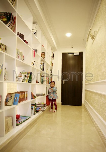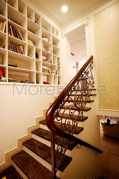 Là căn hộ Duplex nên chi tiết cầu thang dẫn lối nên tầng hai tuyệt nhiên cũng được quan tâm tỉ mỉ với sự đầu tư công sức không hề nhỏ trong việc sử dụng đá cấm thạch và trang trí cầu thang uốn lượn đồng màu. Bên cạnh đó tường đi lên được thiết kế biến hóa thành tủ sách giúp tận dụng không gian một cách tối đa mà không hề bị phô.