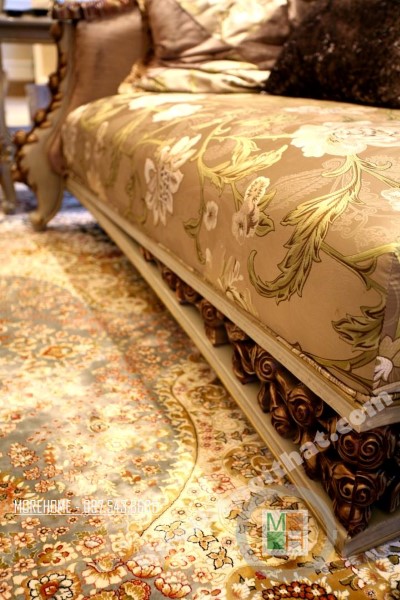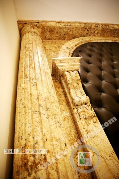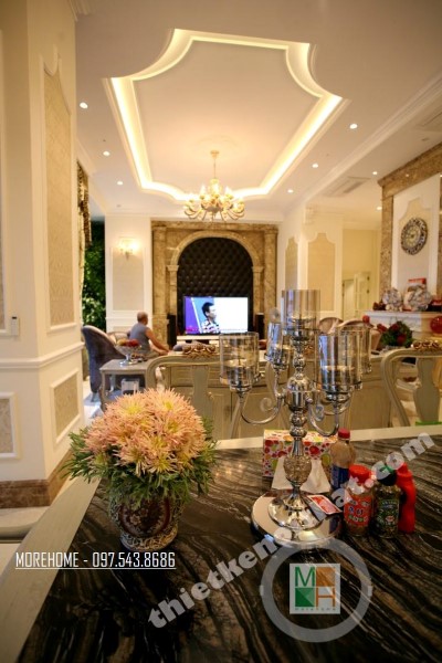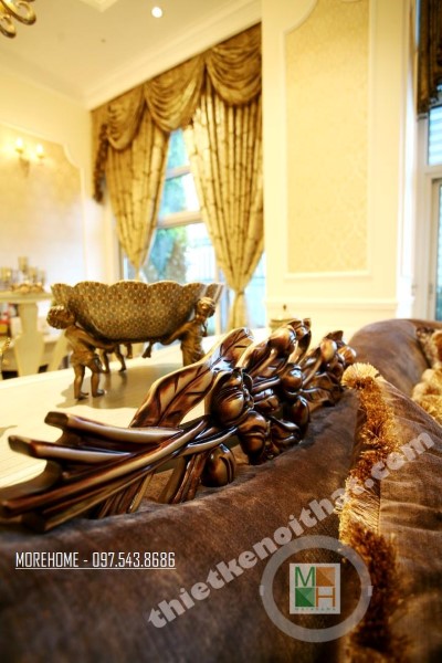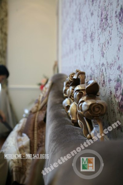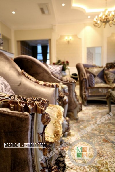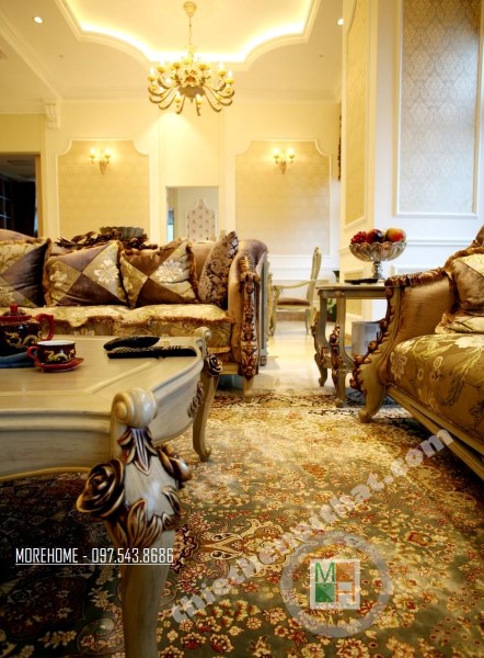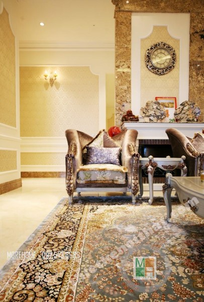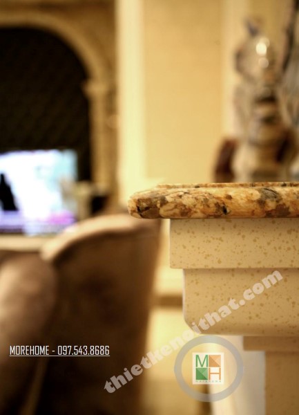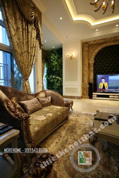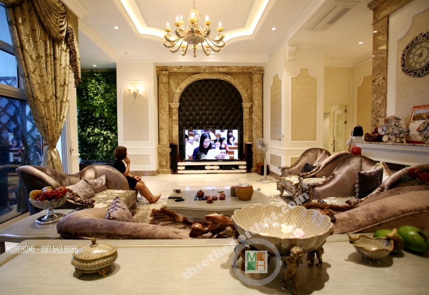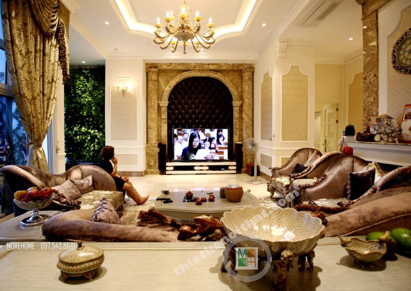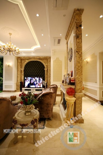 Thiết kế nội thất tân cổ điển phòng khách sử dụng các thiết kế mái vòm nhẹ nhàng. Thiết kế đá thường mang lại cảm giác cứng và thô, không hợp với các đường cong mềm mại hay thiết kế tinh xảo của tân cổ điển. Tuy nhiên việc biến bức tường đá thô cứng thành thiết kế vòm trạm khắc đối xứng đã vô hình xóa đi vẻ cứng nhắc của đá, thay vào đó là sự tinh tế và khéo léo. Bộ sofa to bản chất liệu nhung ấm áp chính là điểm nhấn mang đến sự vững chãi và an toàn cho không gian sinh hoạt chung của cả gia đình. Các thiết kế vách ngăn cứng nhắc được cải tạo thay bằng các bức tường đá vừa tạo ấn tượng thẩm mỹ vừa giúp tạo độ mở cho không gian sống.