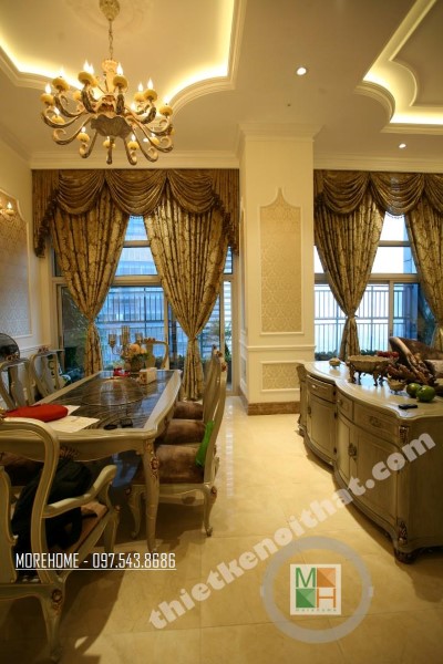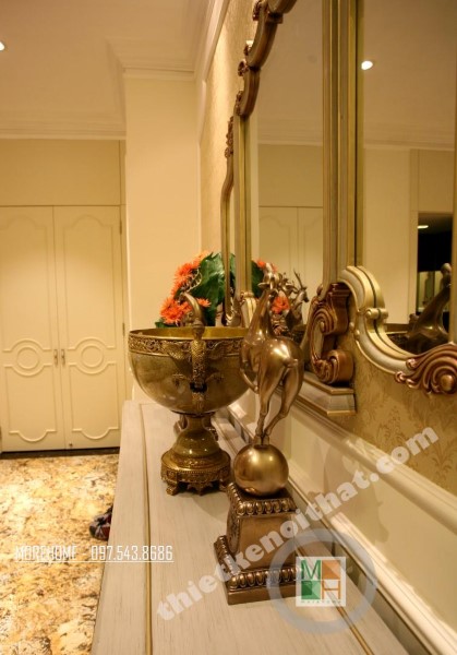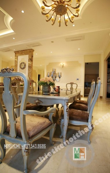 Thiết kế nội thất phòng ăn liền kề chỉ tạo không gian ngăn cách nhẹ nhàng với một tủ tiện lợi vừa đảm bảo tính công năng lại không chắn tầm quan sát của các thành viên trong gia đình. Bàn ăn được thiết kế mang tone màu đồng ánh kim mang lại cảm giác đồng nhất với các thiết kế khác mang tone màu vàng ánh kim nhẹ nhàng.