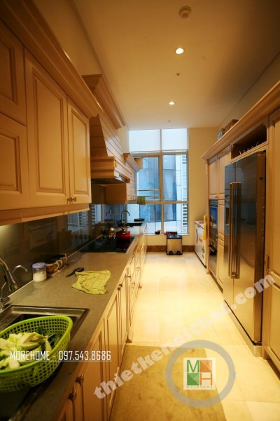 Một trong những điểm yếu của căn hộ Penthouse Keangnam chính là thiết kế bếp khá hẹp. Diện tích bếp không quá rộng khiến cho thiết kế trở nên khá chật chội, các đồ đặc bị gò bó có khi làm không gian trở nên khá bí bách và bất tiện. Để khắc phục nhược điểm này, kiến trúc sư đã khéo léo mở rộng khung cửa mang ánh sáng tự nhiền vào căn phòng. Với thiết kế khéo léo này, căn bếp trở nên khá mở và thoáng, đem lại cảm giác cơi nới về diện tích.