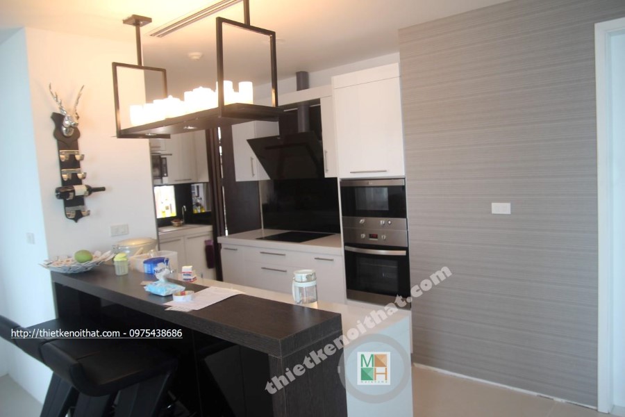 Thi công bếp và bàn ăn là những không gian quan trọng được gia chủ hết sức quan tâm. Kiến trúc sư khéo léo đặt vị trí của hai không gian này cạnh nhau, mang lại tiện nghi cho gia chủ. Thiết kế không gian bếp hiện đại được quây tròn gọn gàng với tone màu trắng tự nhiên, sạch sẽ. Tủ bếp được thiết kế gọn gàng, không nhấn mạnh đến tính thẩm mỹ bằng các chi tiết trang trí tiểu tiết rườm rà mà thay vào đó là sự dễ chịu từ các khối hình đơn giản, sự giản đơn trong trang trí giúp không gian tuy nhỏ hẹp những vẫn toát lên được sự tiện nghi và vẻ đẹp ấn tượng.