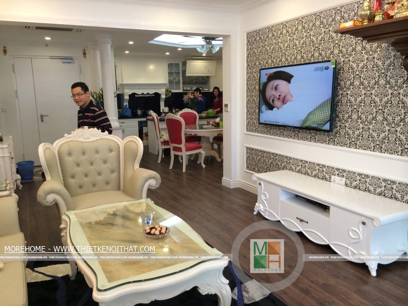 Thiết kế và thi công nội thất chung cư Mandarin Garden là một trong những thiết kế nổi bật thể hiện rõ vẻ đẹp của tân cổ điển. Thiết kế nội thất phòng khách sử dụng tone màu sáng, kem sữa với các chi tiết nổi bật điển hình của tân cổ điển mang đến cho không gian sống một vẻ đẹp thu hút và vô cùng ấn tượng, gợi mở một không gian sống quý phái, sang trọng mang hơi hướng châu Âu cổ điển. Thiết kế ghế sofa to, rộng với các chi tiết trang trí mềm mại và tinh tế góp phần lớn thể hiện phong cách tân cổ điển mà kiến trúc sư muốn thể hiện, tạo sự đồng nhất cho thiết kế.