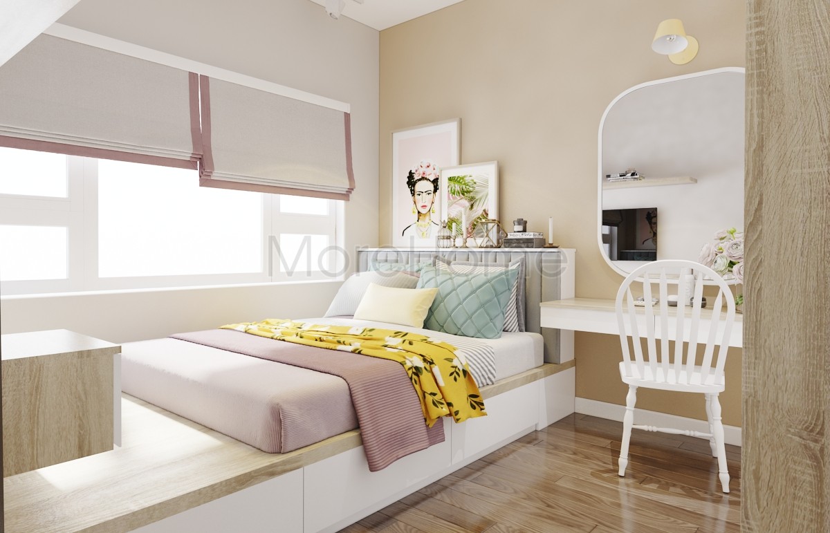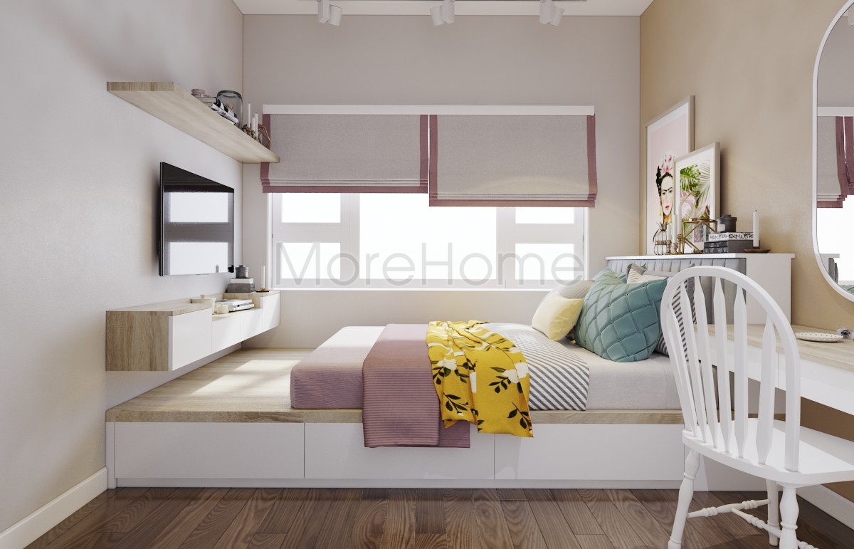 Thiết kế phòng ngủ cho căn hộ chung cư The Park này khá sáng tạo với đồ nội thất. Giường ngủ được sử dụng ở đây là mẫu giường hộp có ngăn kéo ở bên giường tạo sự tiện nghi cho gia chủ để đồ. Giường được đặt sát của sổ để tận dụng hết không gian. Phía dưới chân giường KTS thiết kế kệ tivi và kệ sách đơn giản.