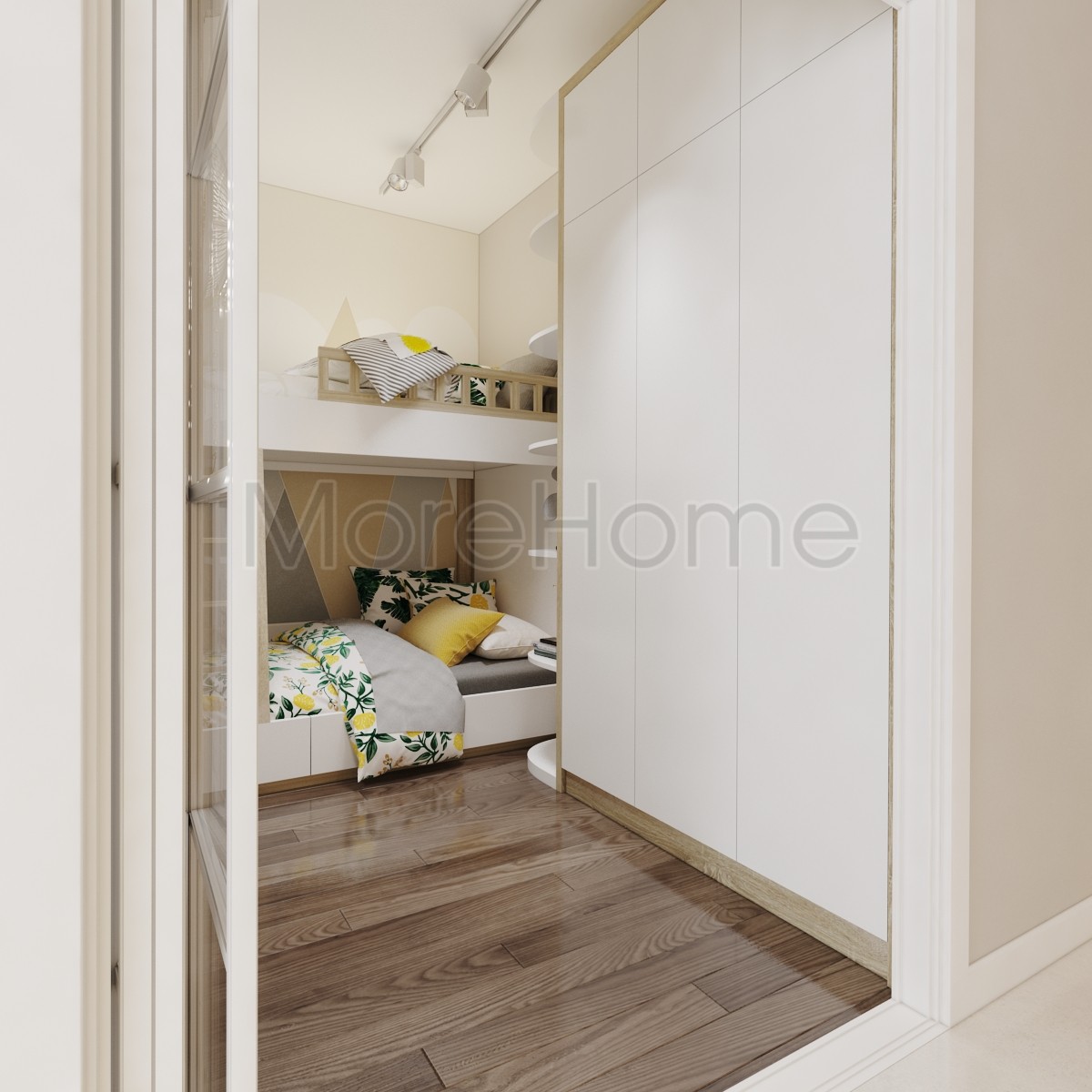 Thiết kế nội thất phòng trẻ em hiện đại với mẫu giường tầng trẻ em. Để tiết kiệm không gian phòng KTS đã sử dụng mẫu giường tầng và tủ áo âm tường vừa đa năng lai vừa tận dụng hết không gian. Kệ sách được đặt áp tường với tủ áo đặt gần giường ngủ giúp cho trẻ dễ dang lấy đồ mình muốn.