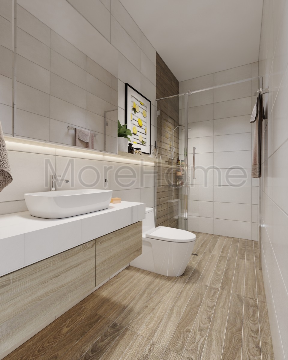 Phòng tắm được thiết kế khá sáng tạo với vách ngăn kính cường lực chia không gian. Bên cạnh đó là một mảng tường trong không gian tắm được sử gỗ ốp tường cao cấp, tạo sự thận thiện trong không gian thư giãn.