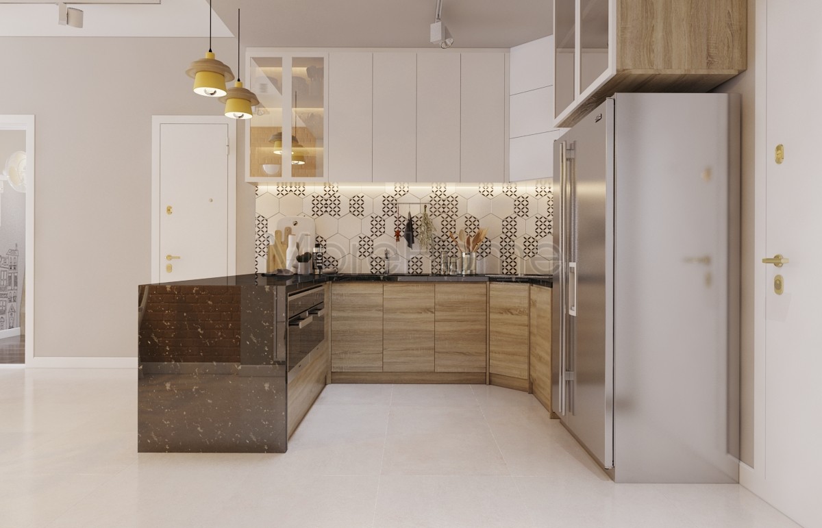 Thiết kế nội thất phòng bếp vintage với mẫu tủ bếp gỗ công nghiệp sơn trắng pha với những đường đường chỉ gỗ không sơn thật mộc mạc và thô sơ. Ngăn cách giữa 2 hệ tủ là mẫu đá ốp bếp tự nhiên họa tiết ô đen trắng tạo sự sáng tạo cho không gian bếp. Đặc biệt hơn với không gian bếp nhỏ xinh nhưng vẫn được thiết kế bàn bar với 2 chiếc ghế gỗ 4 chân giản dị, tạo sự tiện nghi, đa dạng.