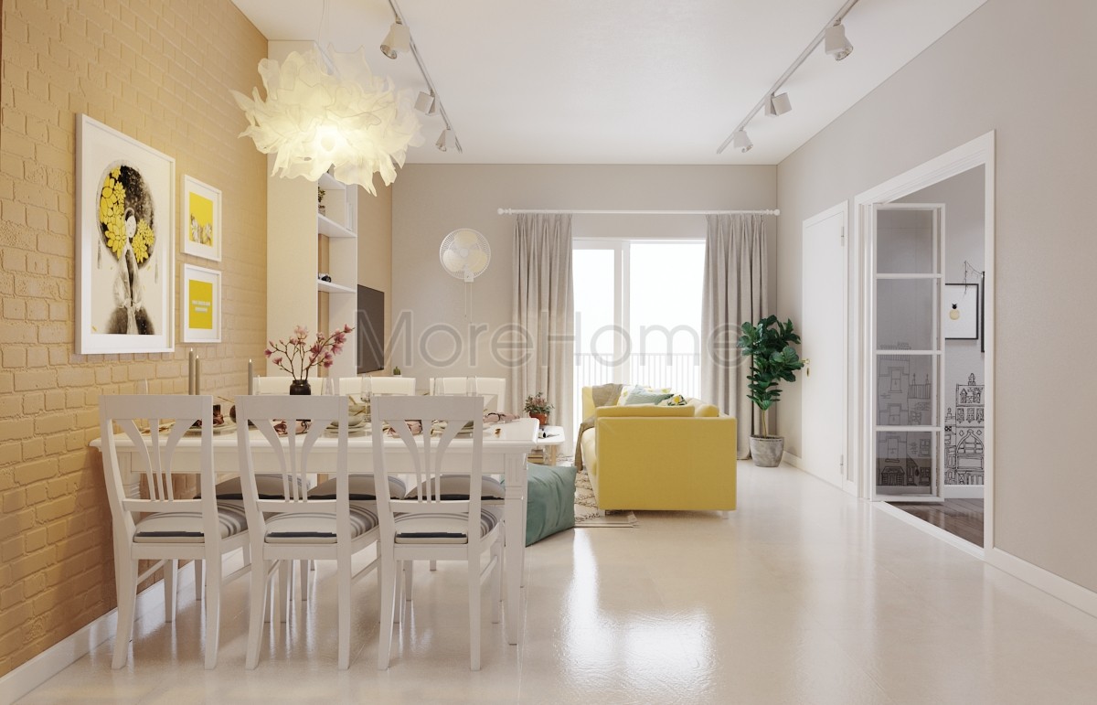 Bên cạnh phòng khách nhỏ nhắn là bộ bàn ăn 6 ghế gỗ công nghiệp màu trắng được đặt bên mảng tường ốp giấy dán tường giả gạch tạo nên không gian ăn uống nhẹ nhàng, sang chảnh, quý phải. Điểm nhấn ở khu vực bàn ăn là chiếc đèn thả họa tiết chùm lửa bằng thủy tinh sang trọng, tinh tế.