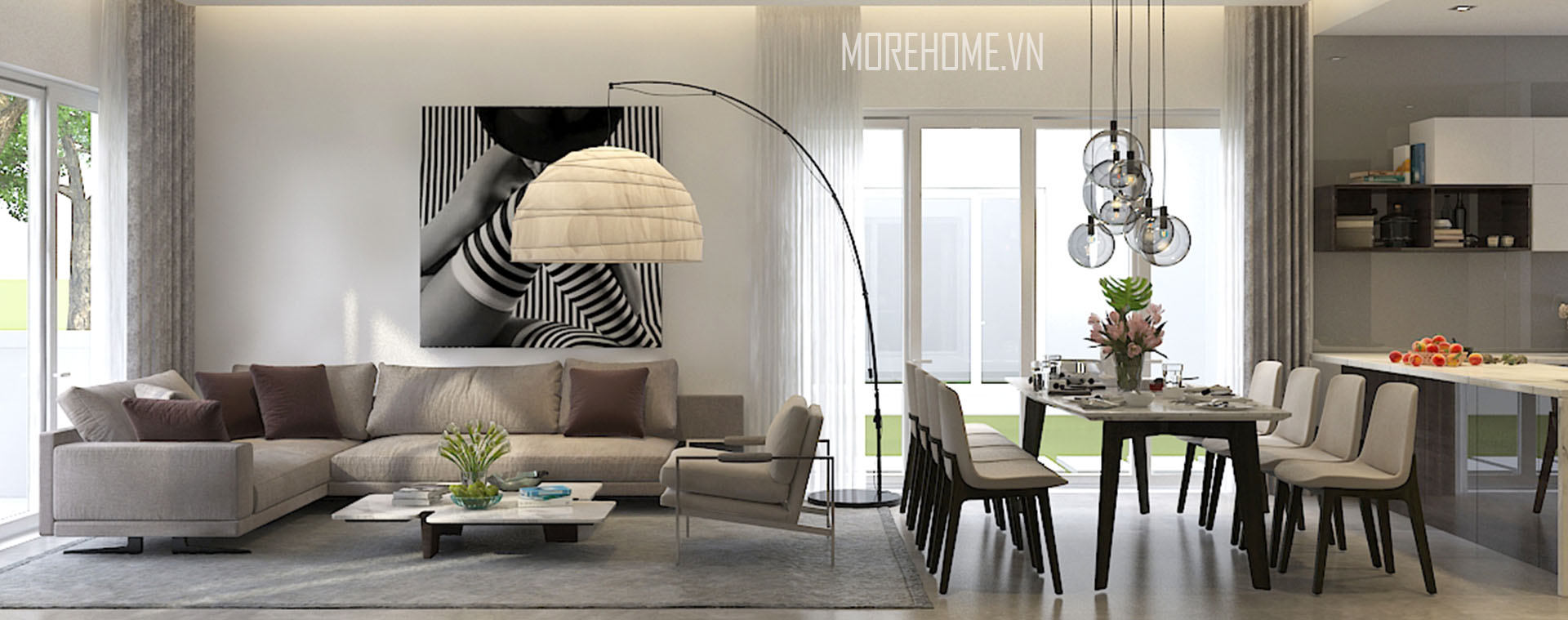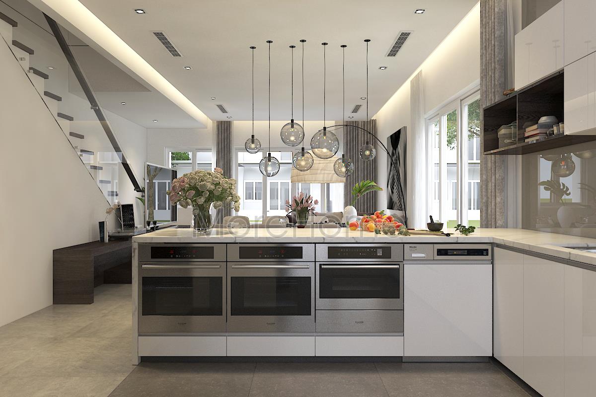 Thiết kế phòng bếp, ăn liên thông với phòng khách giúp cho khu vực tầng 1 thật hiện đại, tiện nghi. Bên cạnh bộ sofa là bộ bàn ăn 8 ghế chân gỗ và mẫu đèn thả hình tròn to nhỏ được đặt bên cạnh của sổ tạo nên một không gian ăn uống thật ấm cúng, sang trọng.