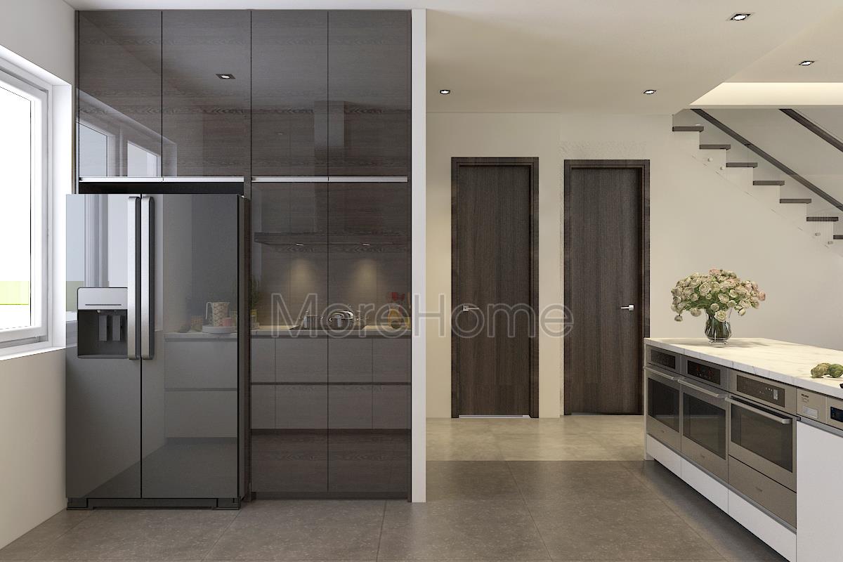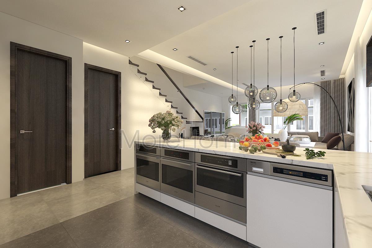 Tiếp đến là khu vực bếp, được thiết kế với chiếc bàn bếp dài hình chữ L mặt bàn được làm bằng đá tự nhiên màu trắng tạo nên sự tinh tế cho không gian bếp. Mẫu tủ bếp được sử dụng ở đây là tủ bếp Acrylic màu trắng kết hợp với đá ốp bếp màu bóng màu lông chuột tạo nên một không gian bếp thật thông thoáng và tươi mới. Một mảng tường khác được thiết kế với bộ tủ âm tường và một chiếc tủ lạnh cùng màu tạo nên sự hiện đại và đa năng nhất định cho người nội trợ.