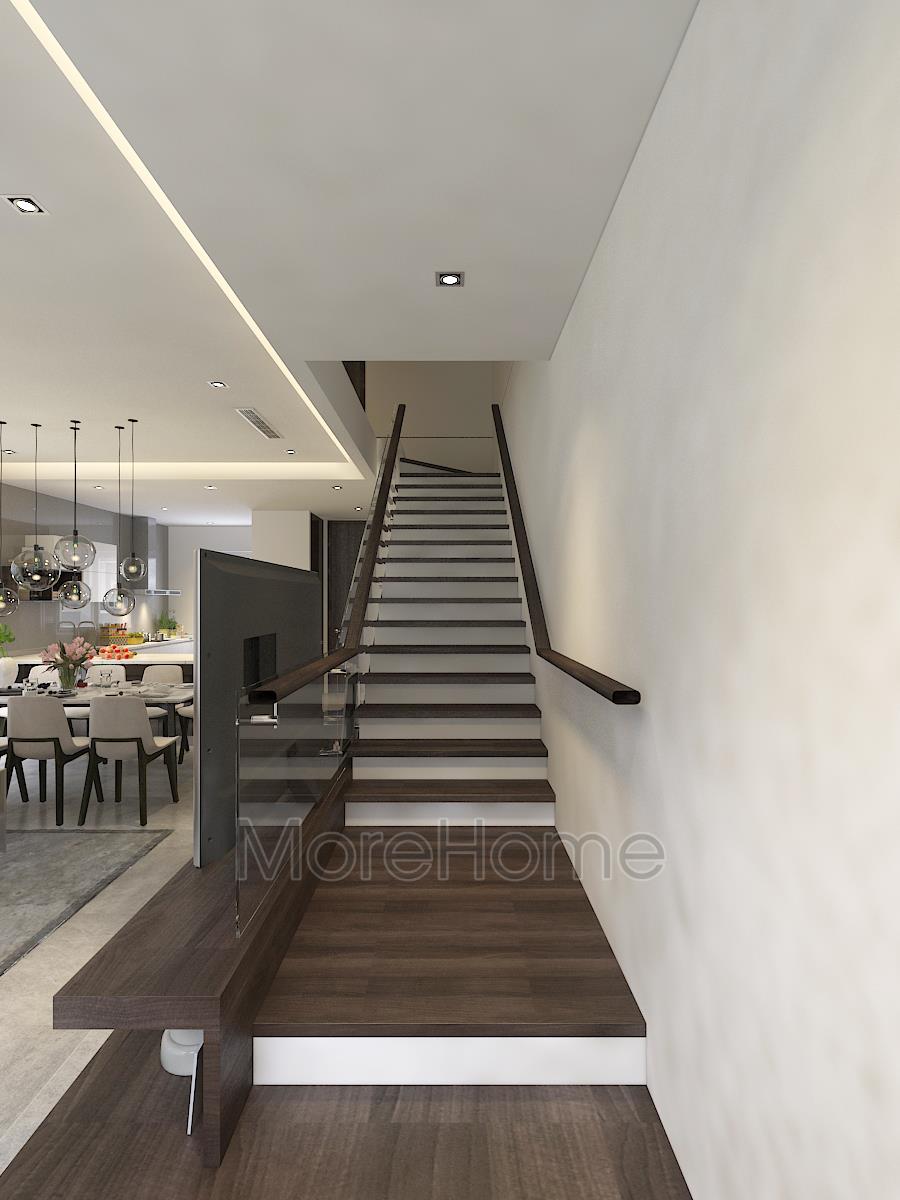 Bước lên tầng 2 bằng mẫu cầu thang gỗ kính tạo cảm giác sang trọng hiện đại trên từng bước chân. Với sự kết hợp giữa gỗ và kính luôn mang đến những bước chân thoải mái, thanh thoát nhất.