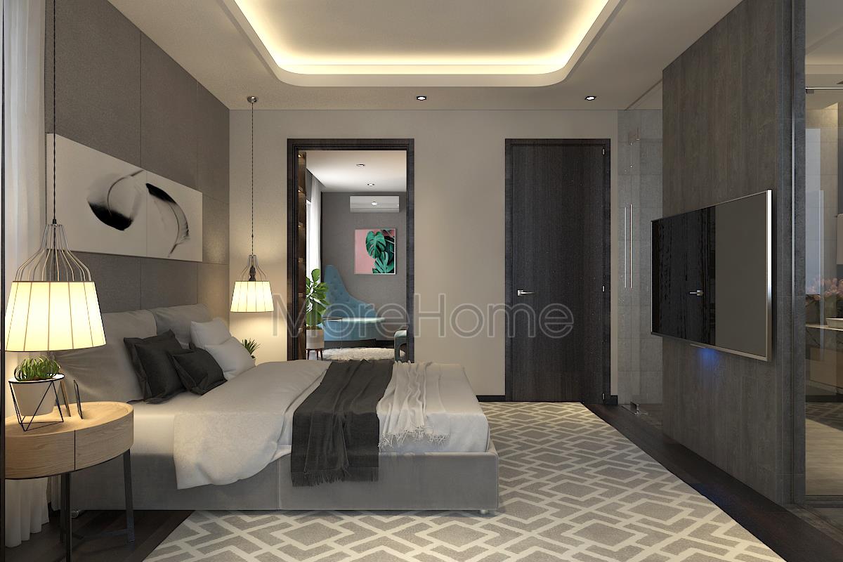 Phòng ngủ được thiết kế hoàn toàn ở trên tầng , những không gian phòng ngủ với đồ nội thất cùng tông màu với không gian tầng 1. Nội thất phòng ngủ được thiết kế khá đơn giản với chiếc giường hình chữ nhật, đối diện là vách ngăn gỗ kính tạo không gian riêng tư cho phòng ngủ với phòng tắm. bên trong phòng ngủ được thiết kế một không gian phòng nhỏ để gia chủ đọc sách hay làm việc.