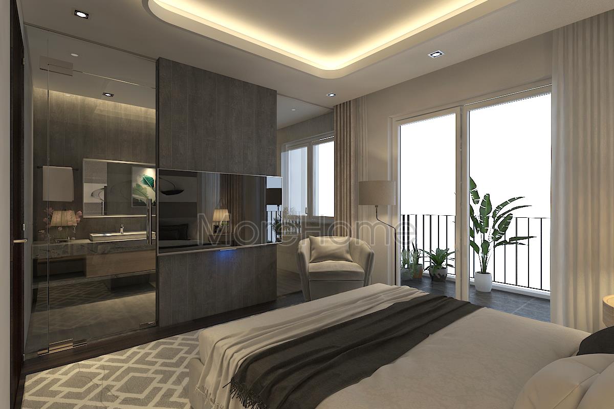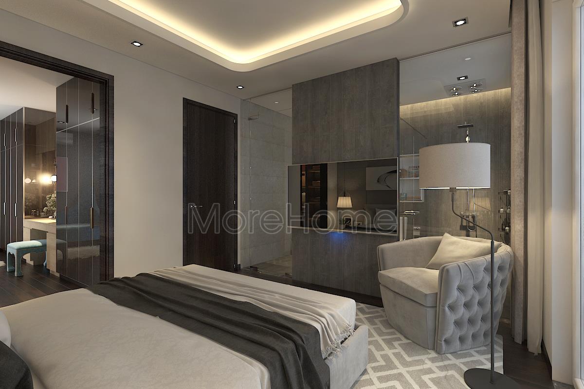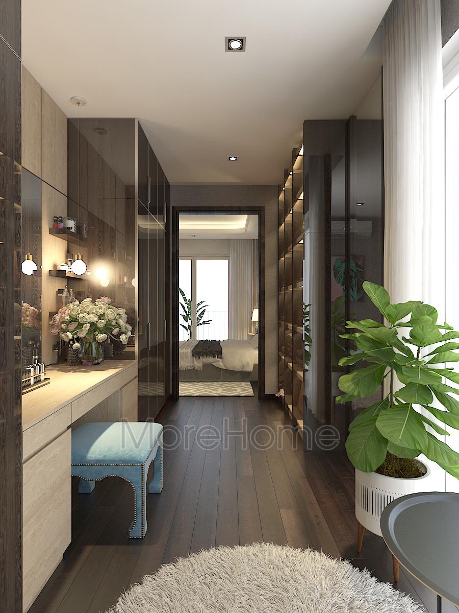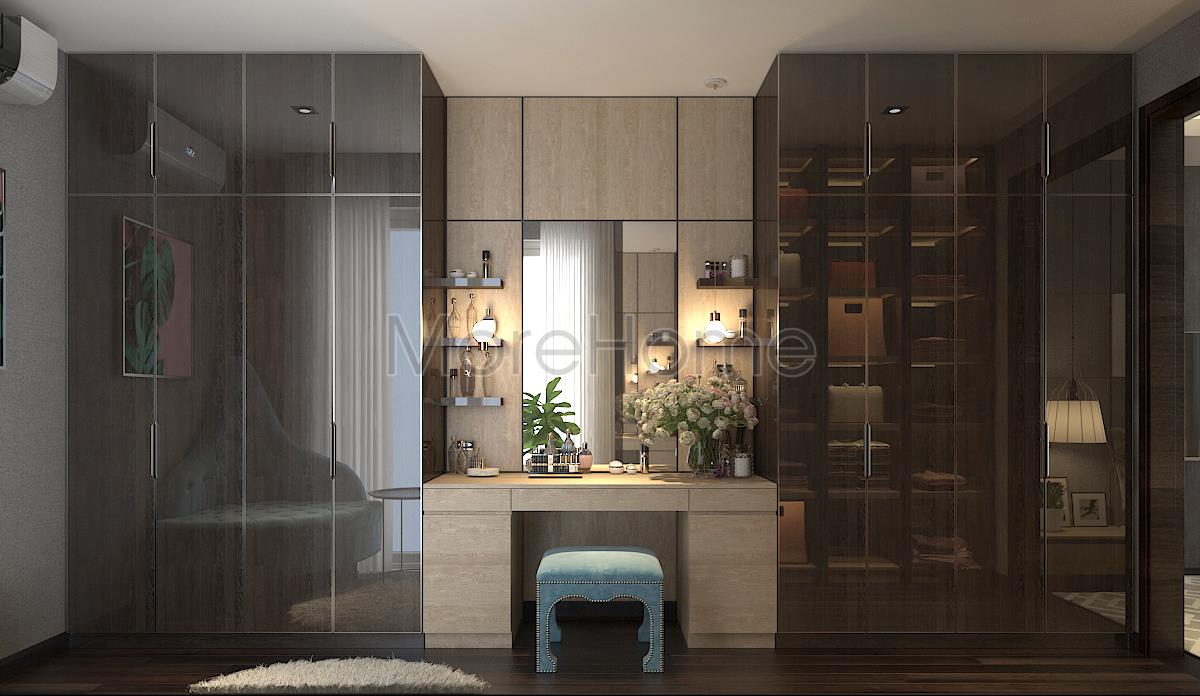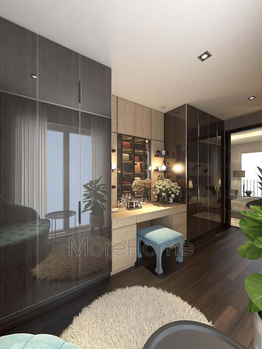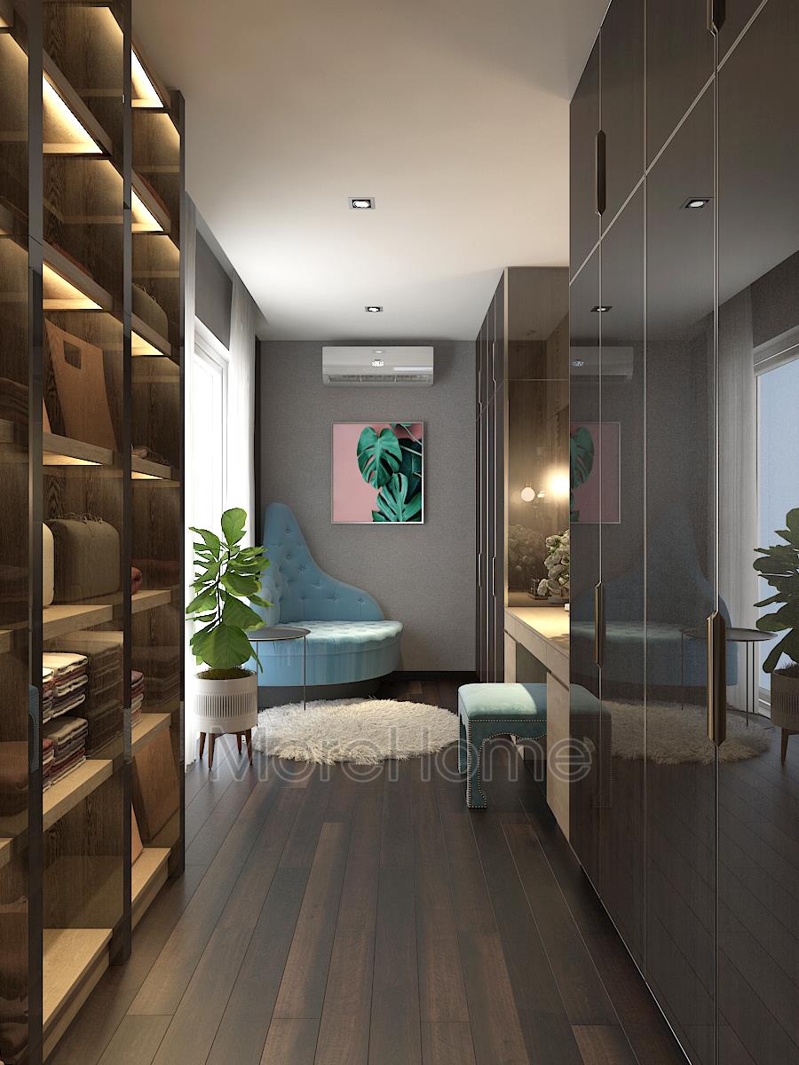 Đi sâu hơn trong phòng ngủ là phòng chứa đồ, với mẫu tủ quần áo được ốp kính sang trọng và đẳng cấp. Chiếc bàn trang đểm được đặt ở giữa 2 chiếc tủ tạo nên sự gọn gàng trong căn phòng. Một góc phòng ngủ được đặt một chiếc sofa khá cá tính bên cạnh cửa sổ giúp gia chủ có không gian đọc sách, thư giãn thoải mái nhất.