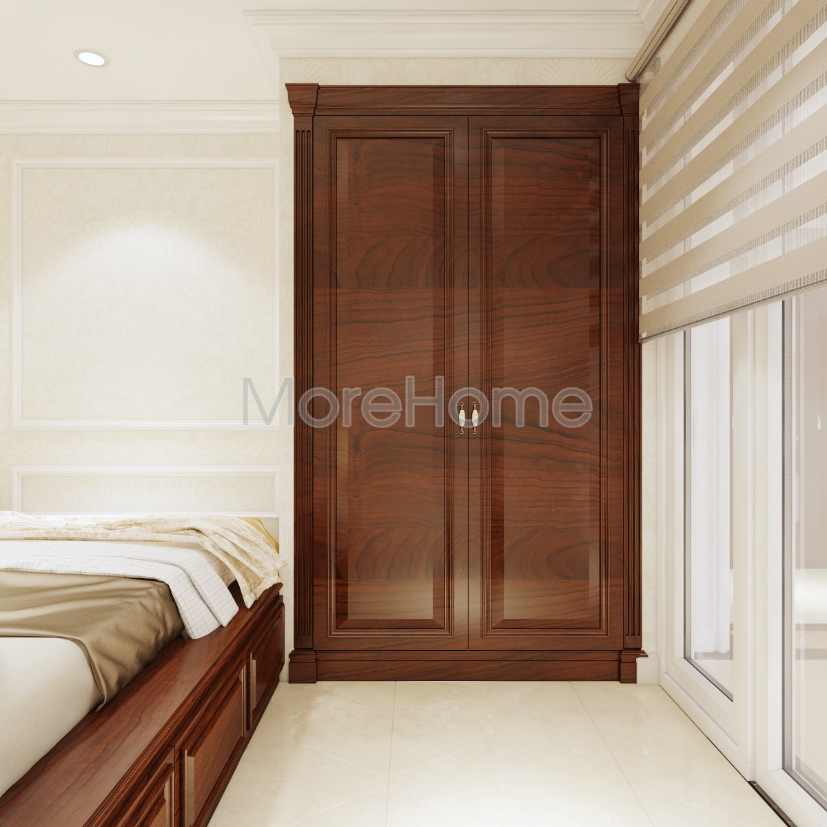 Phòng ngủ 2 được thiết kế nhẹ nhàng hơn cũng với hai gam màu trắng và nâu. Giấy dán tường được sử dụng ở mảng tường đầu giường làm điểm nhấn cho căn phong thể hiện được vẻ đẹp tân cổ điển. hệ thống tủ đồ , tủ tivi và tủ kệ trang trí được thiết kế liền với nhau tạo nên một không gian lưu trữ liền mạch cho căn phòng.
