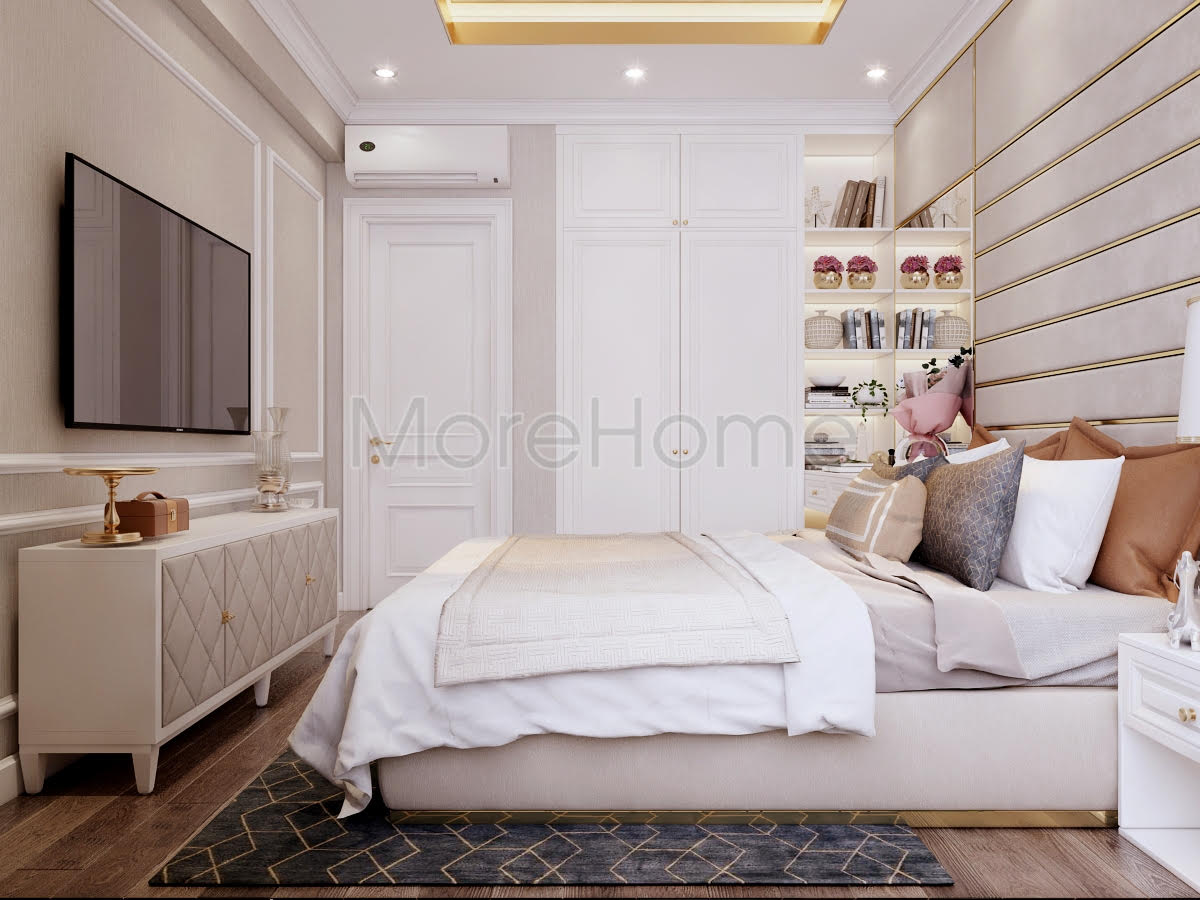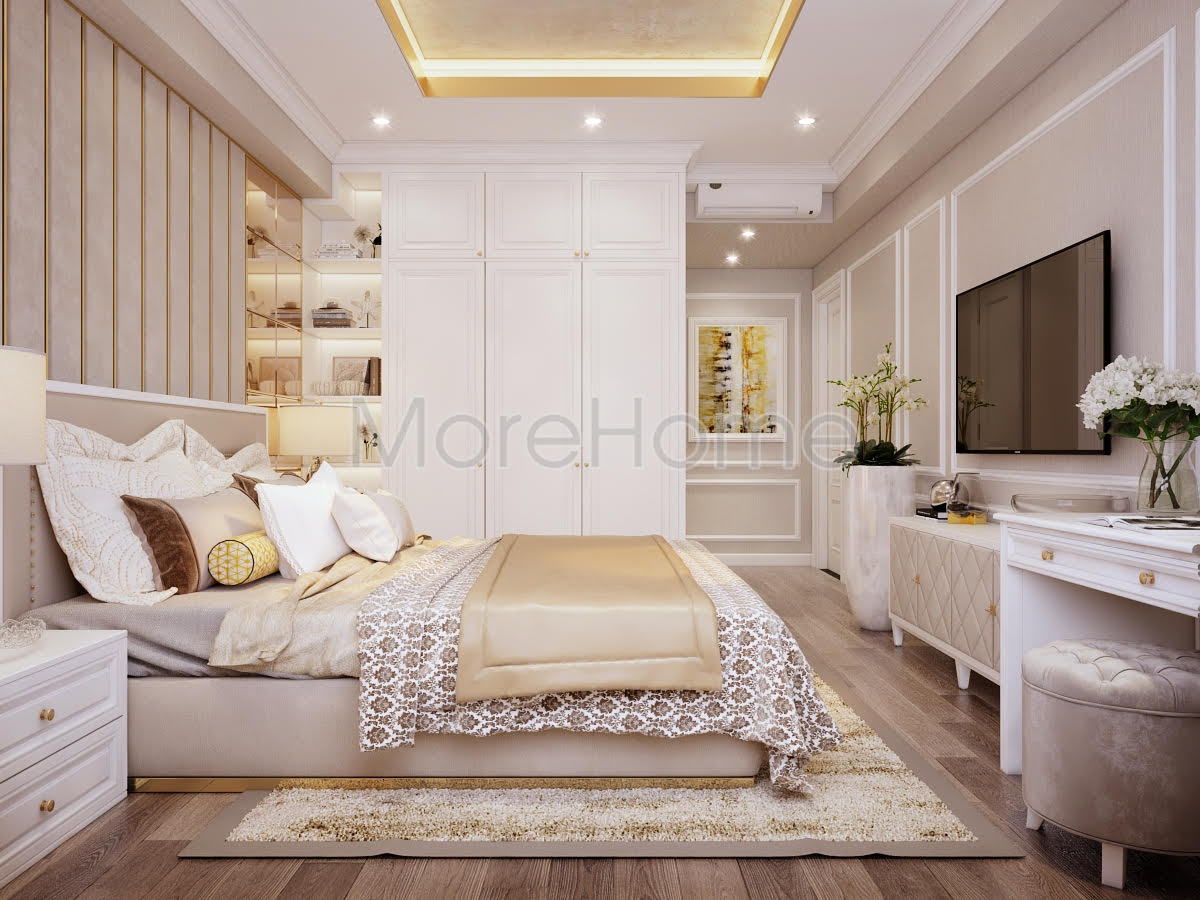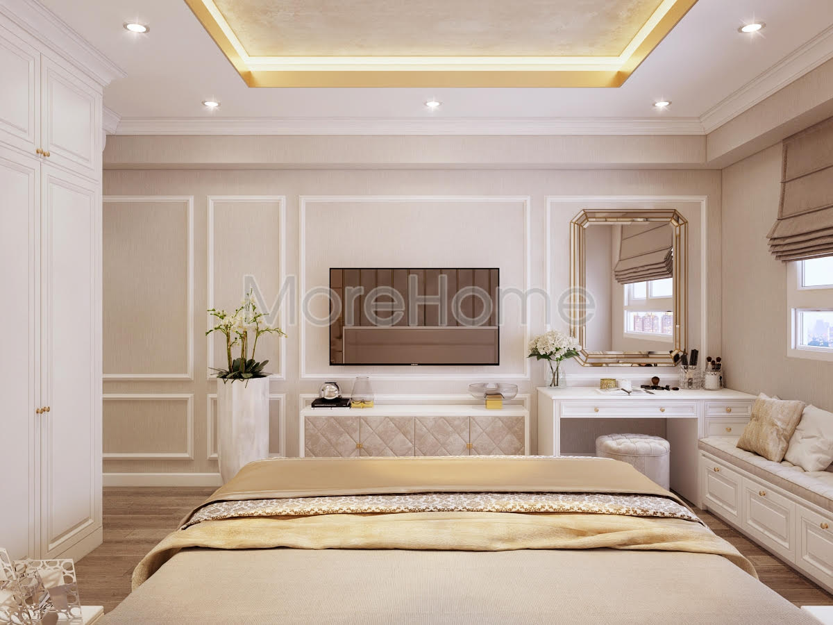Thiết kế phòng ngủ mang phong cách tân cổ điển như những không gian khác của căn hộ. Đầu giường được ốp bằng vách nỉ cao cấp không thể thiếu những đường kẻ ngang dọc tạo nên sự mạch lạc trong phân chia không gian. Vì diện tích không quá lớn nên bàn phấn được đặt cạnh giường thay vào đó chỉ có 1 tab đầu giường được sử dụng. Gương trang điểm lớn vuông vắn nhưng vẫn rất ăn nhập với vách đầu giường. Như thường lệ, tủ quần áo vẫn là tủ kịch trần nhằm sử dụng tối đa không gian, khi ở chung cư chiều cao của trần tương đối thấp. Hệ thống chiếu sáng của căn phòng được chia thành 2 phần rõ ràng: 1 để chiếu sáng với cường độ lớn hơn và một loại là đèn hắt được sử dụng khi gia chủ không muốn có ánh sáng quá chói lóa.
