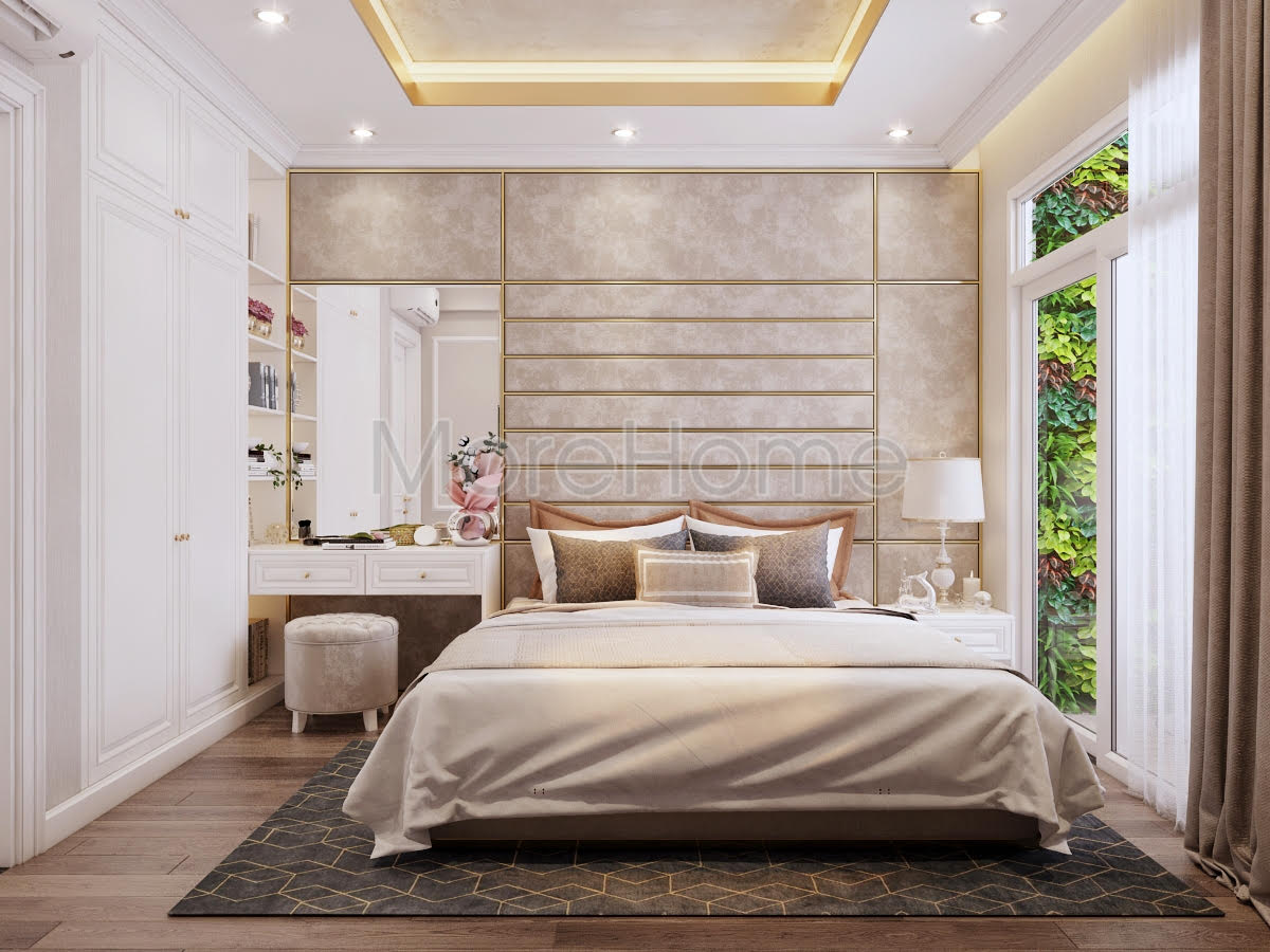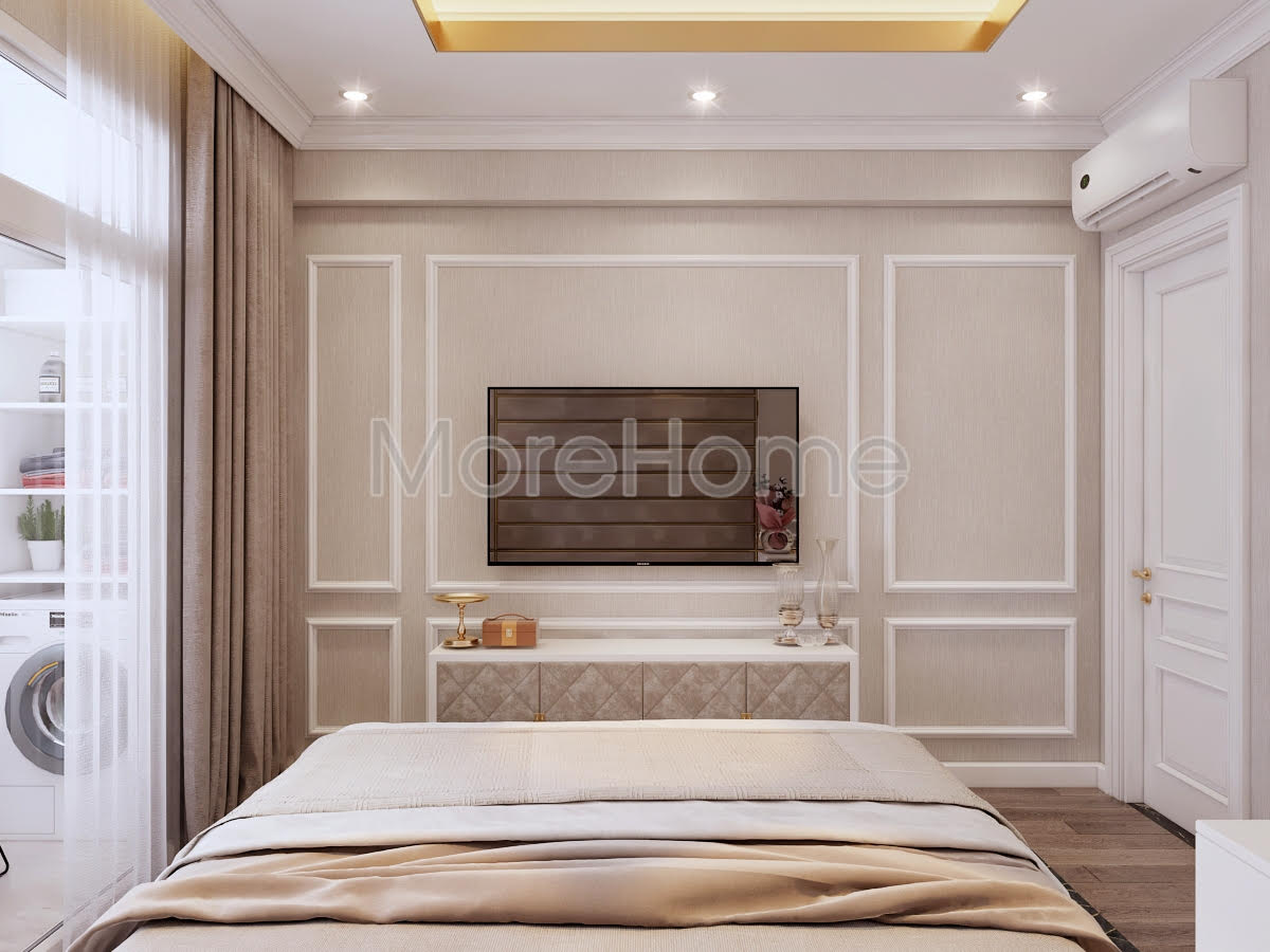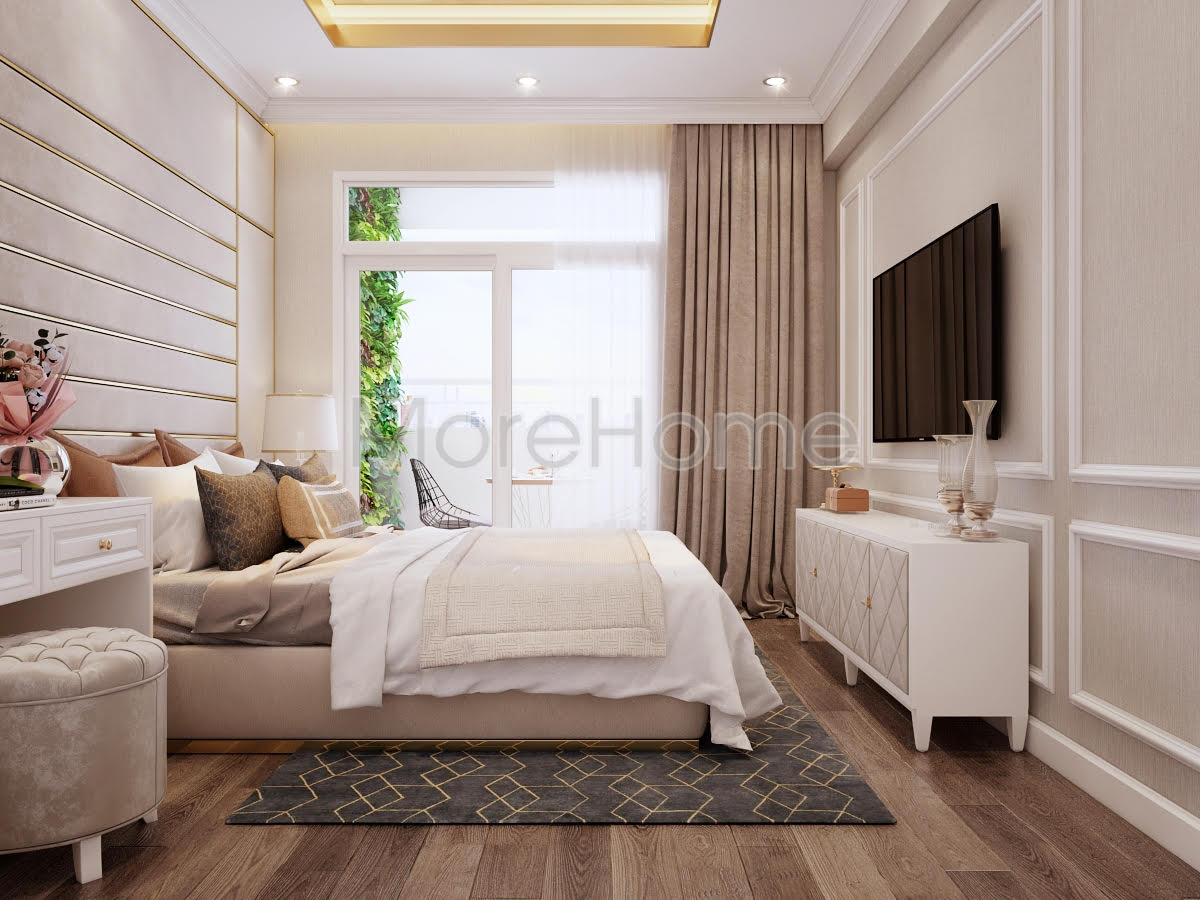 Thiết kế phòng ngủ mang phong cách tân cổ điển như những không gian khác của căn hộ. Đầu giường được ốp bằng vách nỉ cao cấp không thể thiếu những đường kẻ ngang dọc tạo nên sự mạch lạc trong phân chia không gian. Vì diện tích không quá lớn nên bàn phấn được đặt cạnh giường thay vào đó chỉ có 1 tab đầu giường được sử dụng. Gương trang điểm lớn vuông vắn nhưng vẫn rất ăn nhập với vách đầu giường. Như thường lệ, tủ quần áo vẫn là tủ kịch trần nhằm sử dụng tối đa không gian, khi ở chung cư chiều cao của trần tương đối thấp. Hệ thống chiếu sáng của căn phòng được chia thành 2 phần rõ ràng: 1 để chiếu sáng với cường độ lớn hơn và một loại là đèn hắt được sử dụng khi gia chủ không muốn có ánh sáng quá chói lóa.