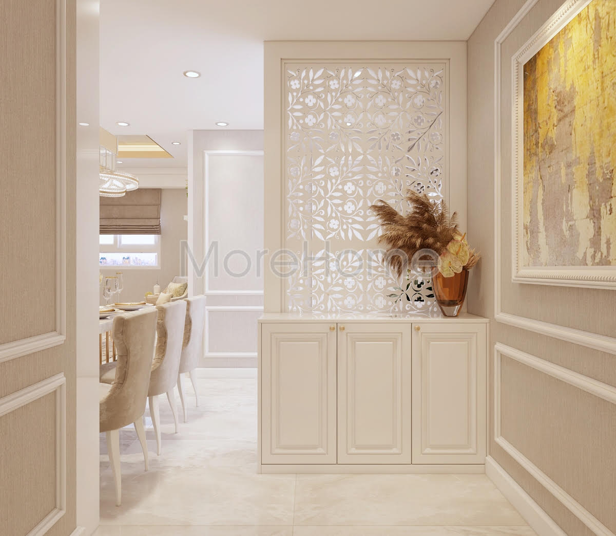 Bạn đang được chiêm ngưỡng mẫu thiết kế nội thất chung cư tân cổ điển do KTS Morehome thực hiện. Đứng trước vẻ đẹp lộng lẫy của căn hộ chung cư 1050 quận Bình Thạnh Tp HCM bạn bị cuốn hút bởi màu sắc và đồ nội thất của căn hộ này.