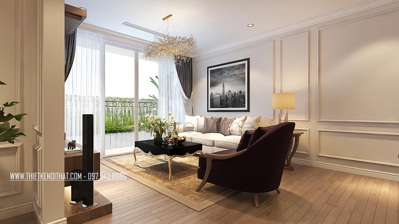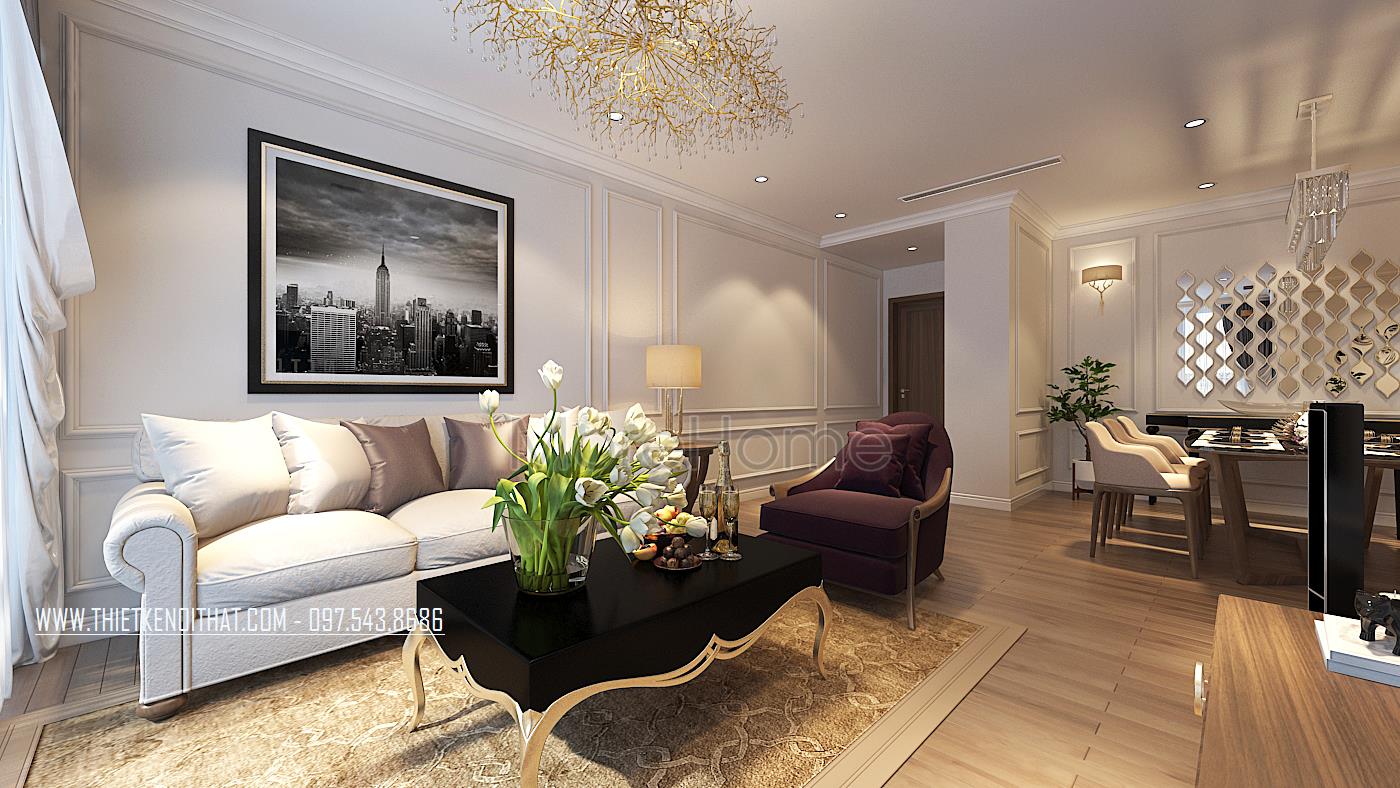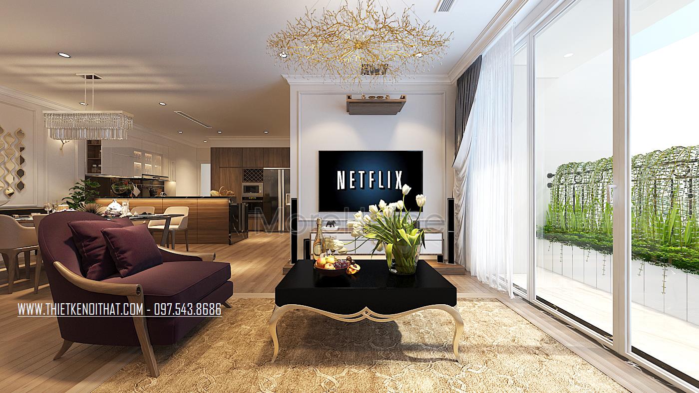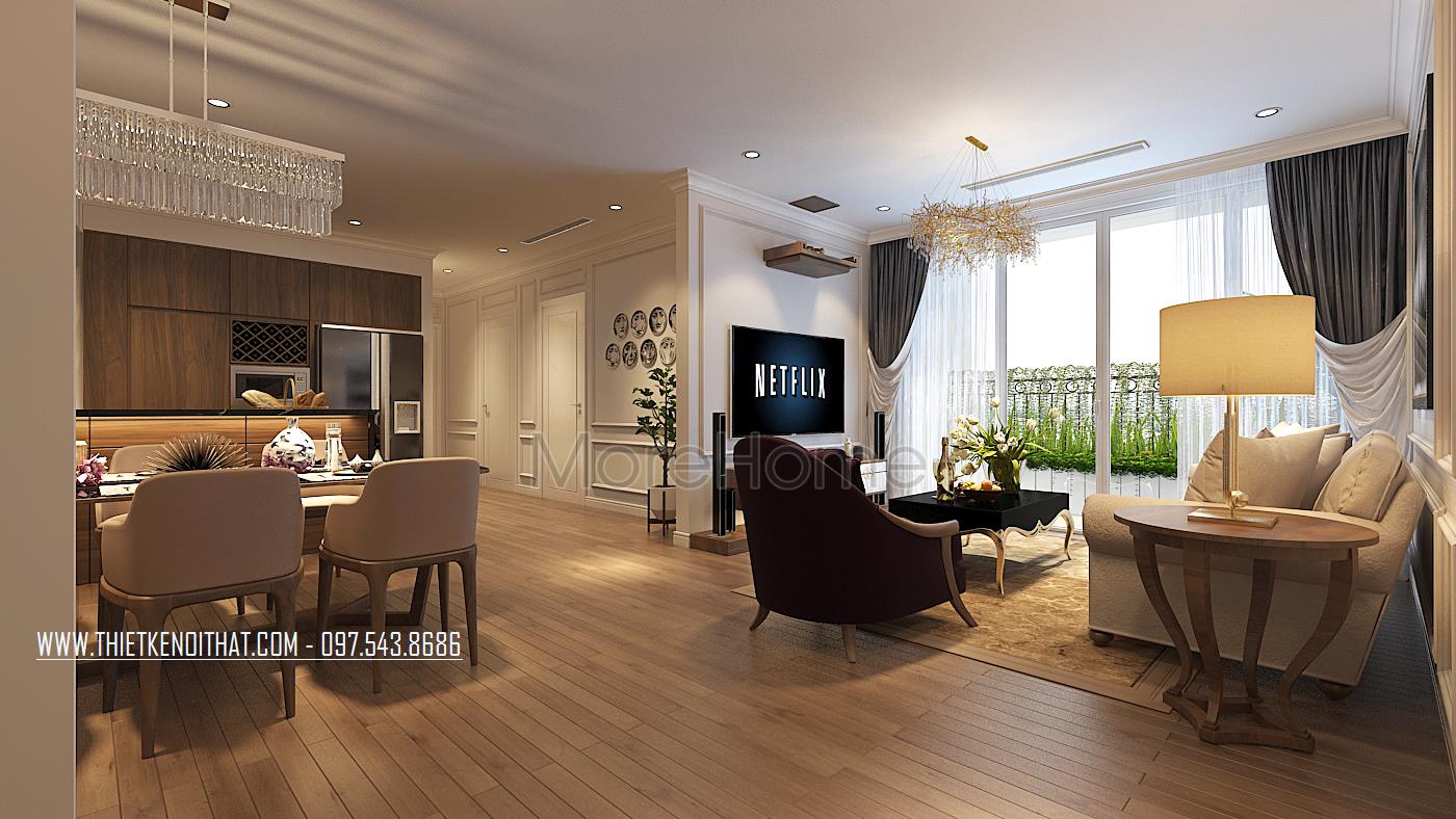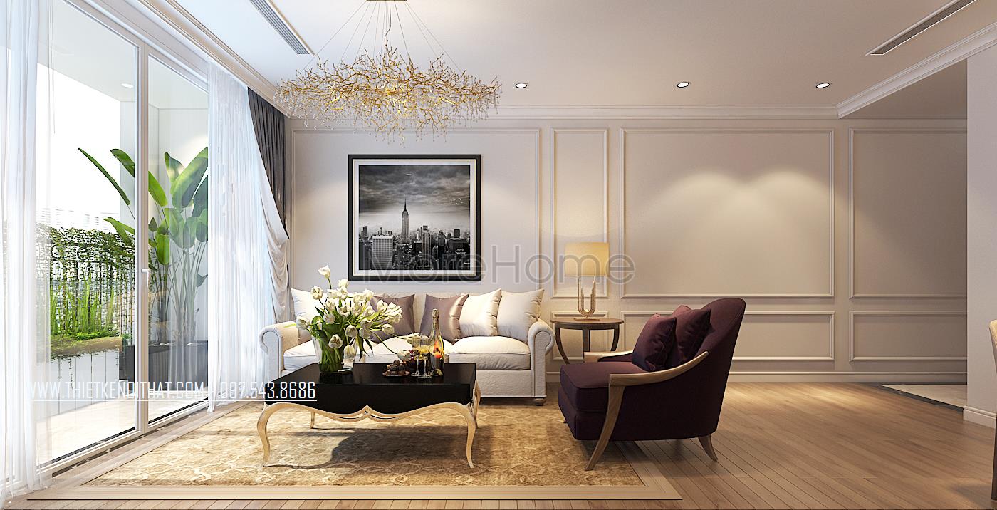 Đi qua khu vực sảnh chúng ta đến với không gian phòng khách. Từ đây không gian được mở rộng ra rất nhiều. Sàn được lát bằng gỗ tạo cảm giác sang trọng và ấm cúng, KTS đã sử dụng tông màu sáng cùng với việc sử dụng phào chỉ rất hợp lý và tinh tế làm cho những mảng trống ở phòng khách không còn bị nhàm chán mà làm cho không gian phòng khách đậm chất tân cổ điển.