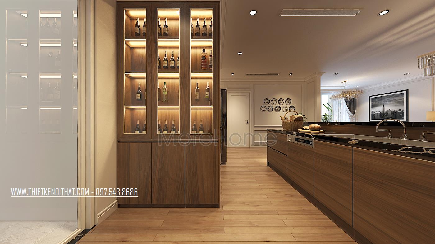 Thiết kế phòng bếp, khu vực dành cho các bà nội trợ được KTS tâm lý thiết kế với diện tích khá lớn. Bếp được thiết kế theo hình chữ L kết hợp với hệ tủ rượu và tủ lạnh. Hệ bàn bếp được bố trí đầy đủ tất cả các công năng cần thiết để phục vụ cho người nội trợ như tủ lạnh, chậu rửa, bếp từ,máy hút mùi, máy rửa bát,…vị trí các thiết bị được KTS bố trí hợp lý tạo sự thuận tiện tối đa cho người nội trợ. Về tính thẩm mỹ và đường nét thiết kế, tủ bếp trên và dưới được KTS sử dụng 2 chất liệu khác nhau tạo sự tách biệt rõ rang về hình khối, mang đến sự khỏe khoắn trong đường nét.