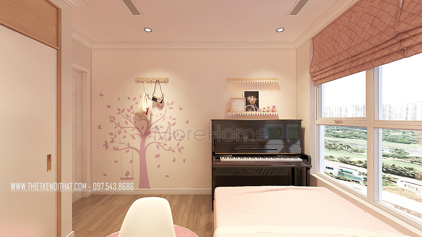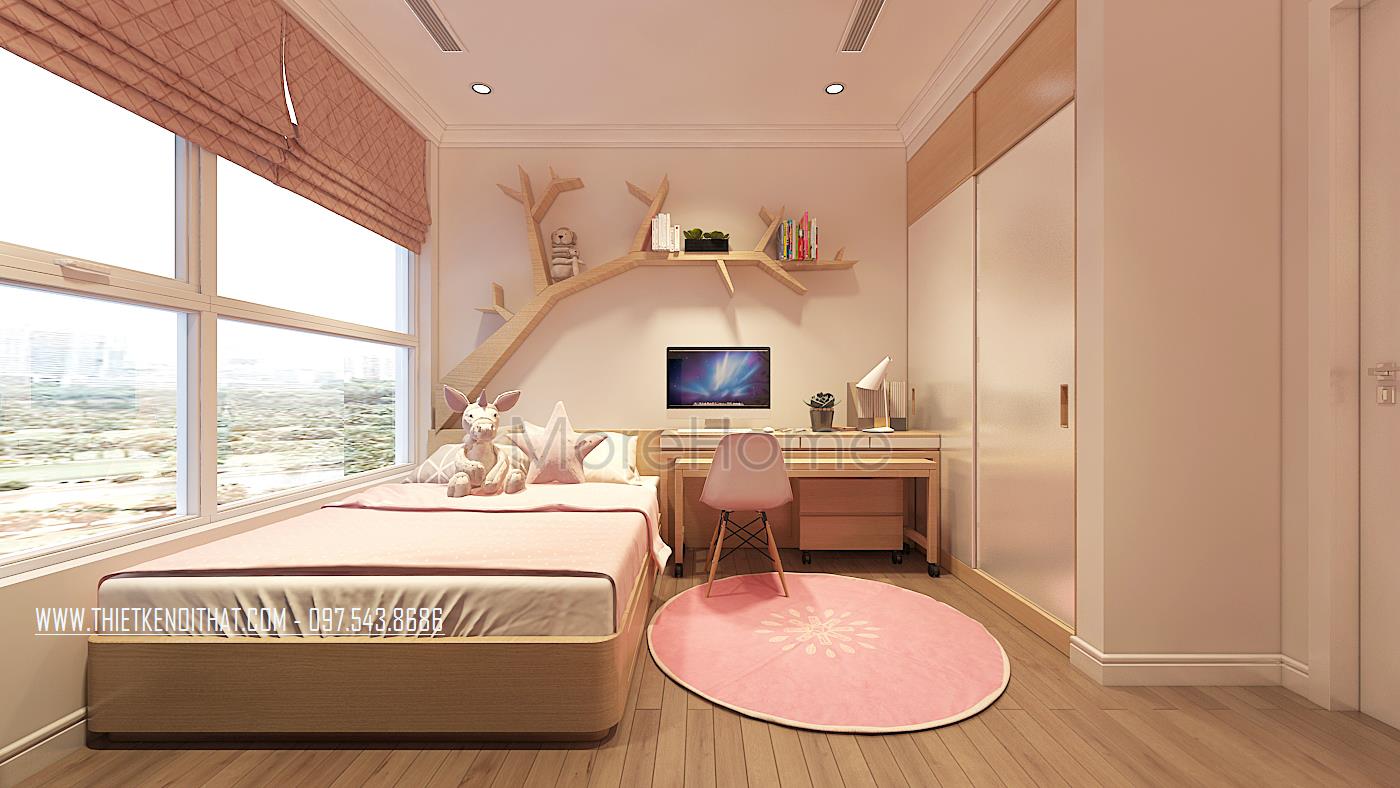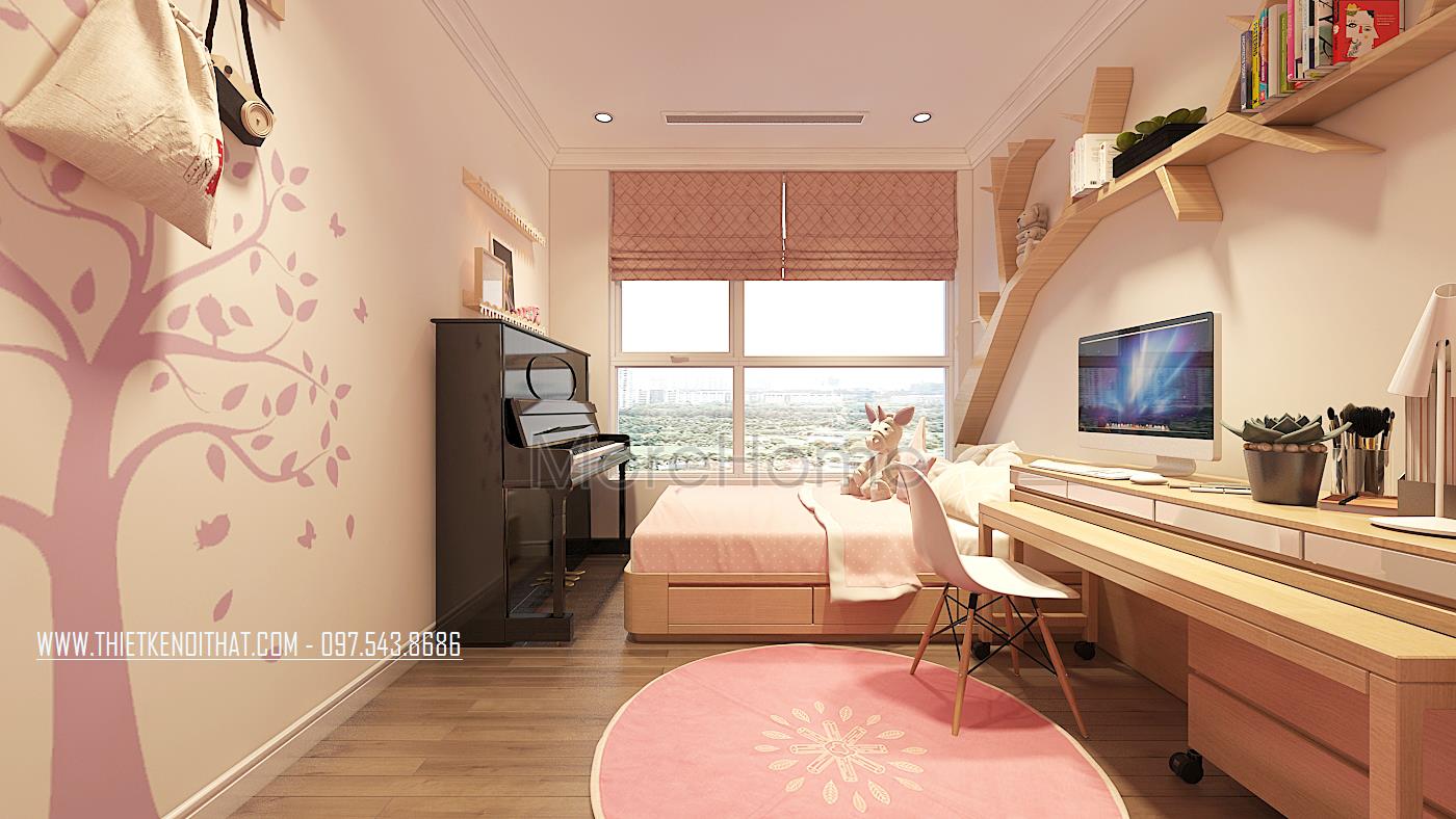 Thiết kế phòng ngủ bé gái với tong màu hồng kết hợp với gỗ công nghiệp sáng màu. Phòng được bố trí gồm 1 giường, 1 bàn học, 1 tủ quần áo và 1 chiếc đàn piano để bé thỏa mãn niềm yêu thích âm nhạc của mình. Màu hồng nhạt được dùng rất vừa phải và nhẹ nhàng. Kệ sách hình cây ở đầu giường được thiết kế rất độc đáo và đủ không gian sử dụng cho bé.