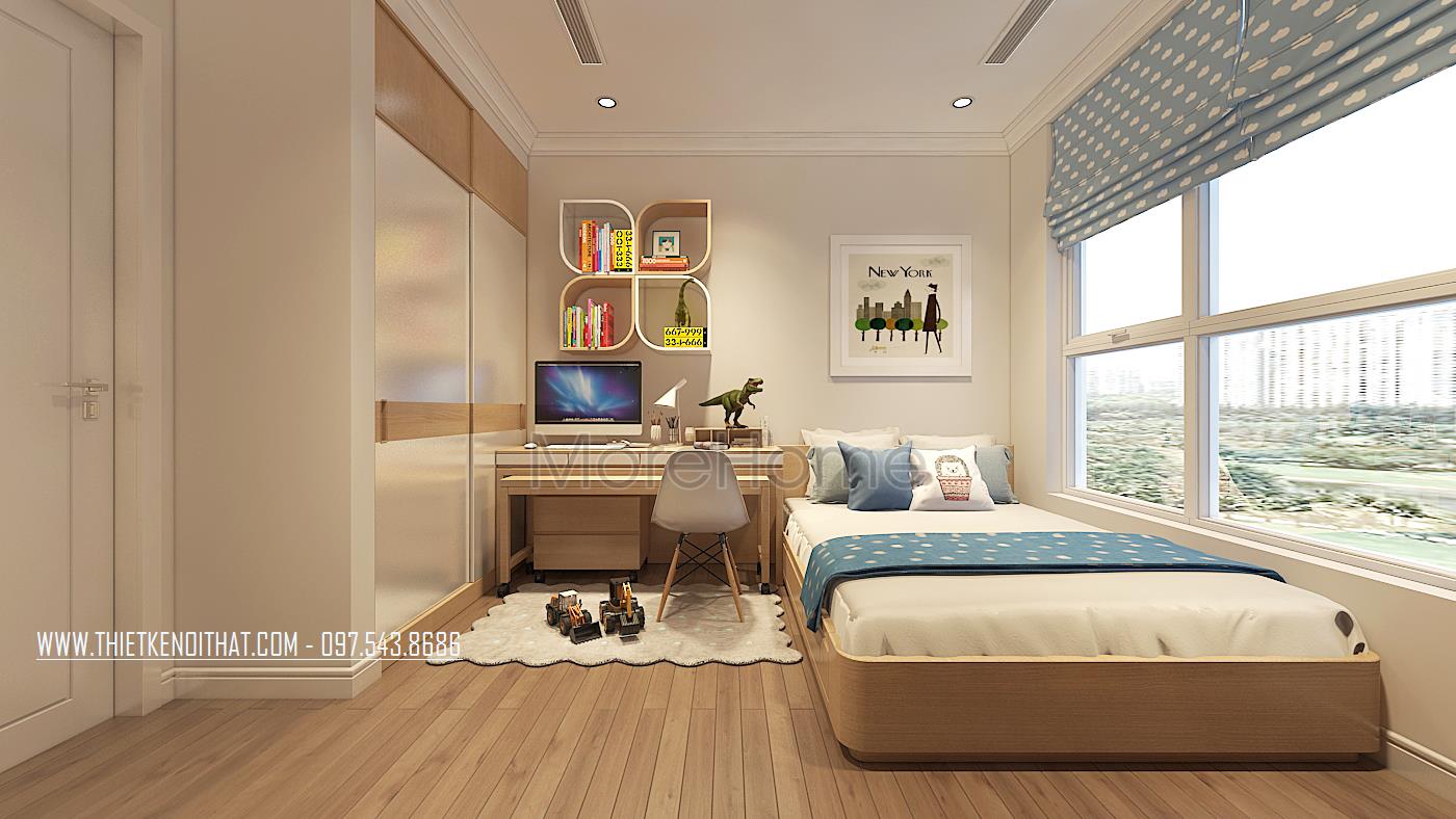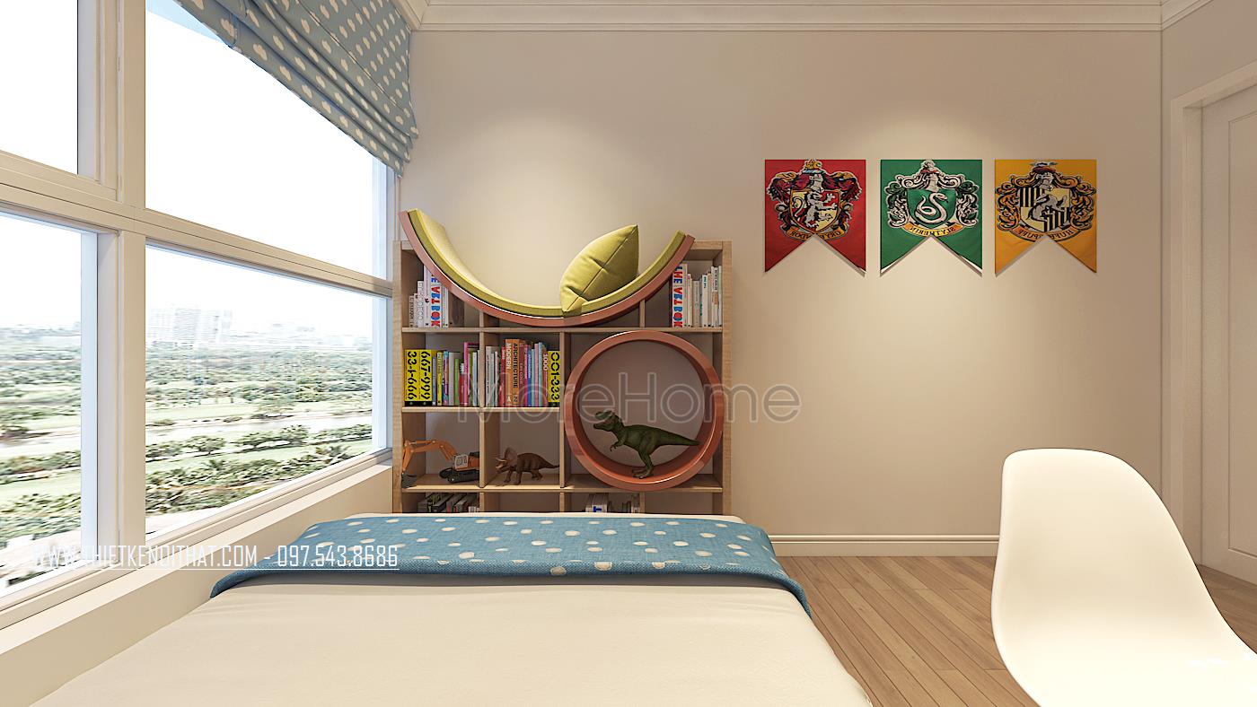Thiết kế phòng bé trai năng động, sáng tạo. Đồ nội thất được KTS phối màu phù hợp với sự tinh nghịch của bé trai. Gỗ sáng màu kết hợp với màu xanh của ga đệm, màu xanh của rèm, cùng với màu vàng và đỏ cảu giá sách tạo nên một tổng thể rất là vui mắt.