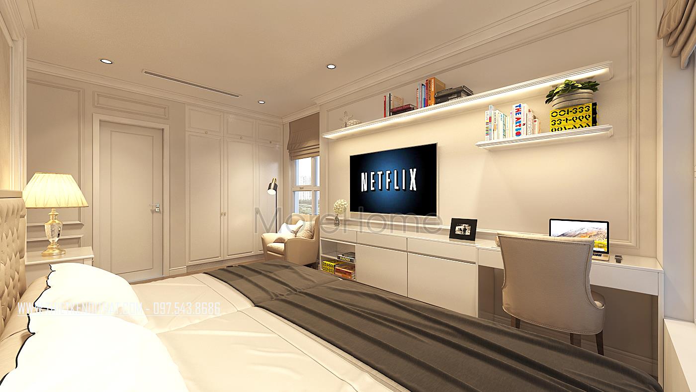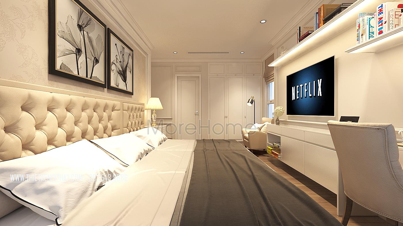 Sang phòng ngủ Master, KTS vẫn chọn tông màu kem sữa làm chủ đạo, kết hợp với phào chỉ và đồ décor mang phong cách tân cổ điển. Giường ngủ được đặt ở vị trí chính giữa căn phòng, khung giường được thiết kế với chất liệu gỗ sơn trắng, có 3 ngăn kéo rất là tiện lợi, đầu giường được bọc nỉ rất sang trọng. Ở phòng ngủ này bàn làm việc được thiết kế liền với kệ tivi tạo sự mạch lạc trong đường nét hình khối, cùng với đó là chiếc ghế tựa đọc sách được đặt ở vị trí gần cửa sổ là nơi để thư giãn rất thú vị cho gia chủ. Tủ quần áo được thiết kế âm tường hiện đại, tiết kiệm diện tích.