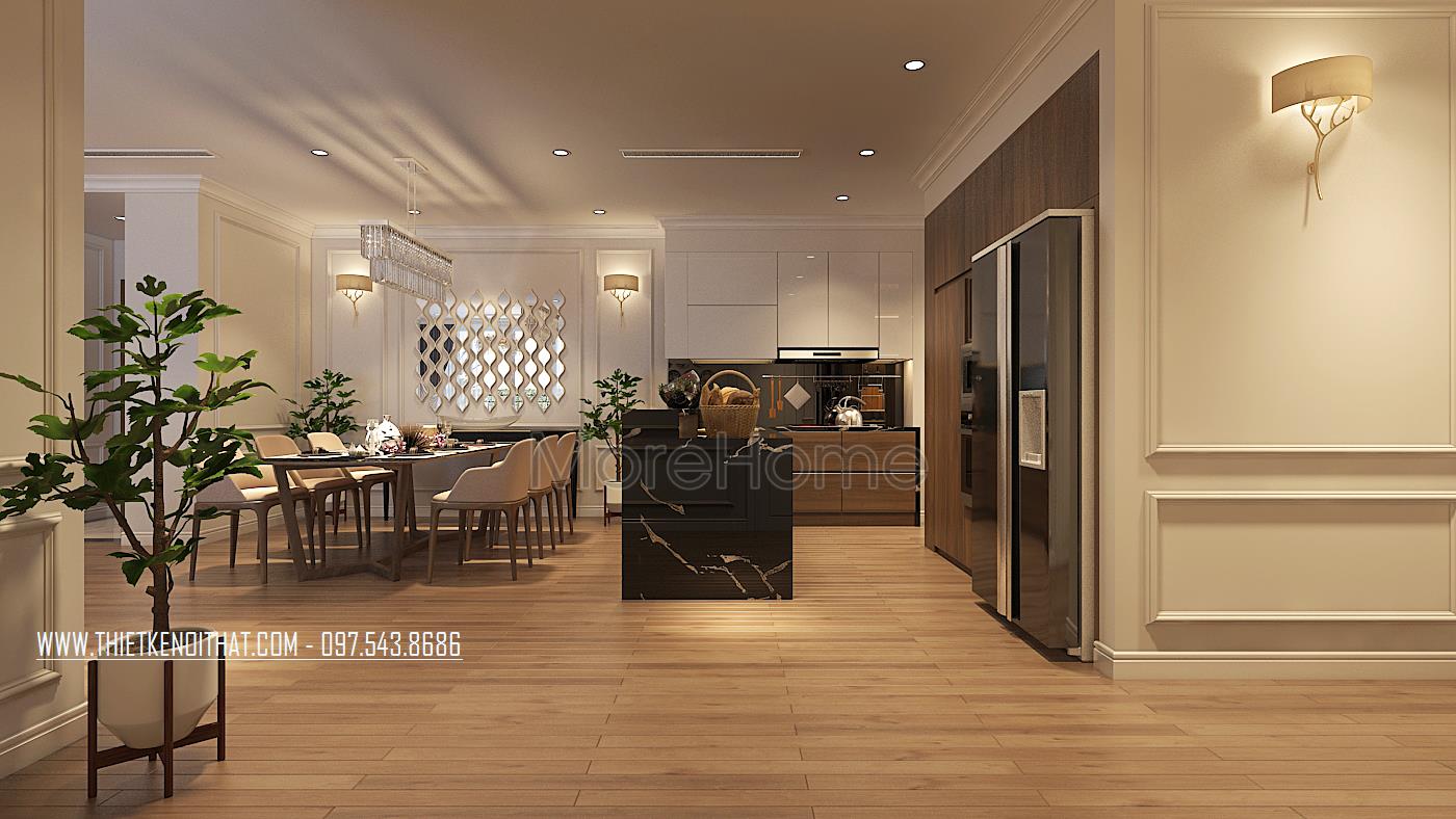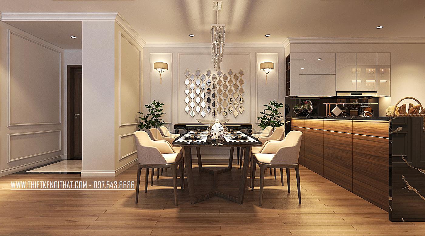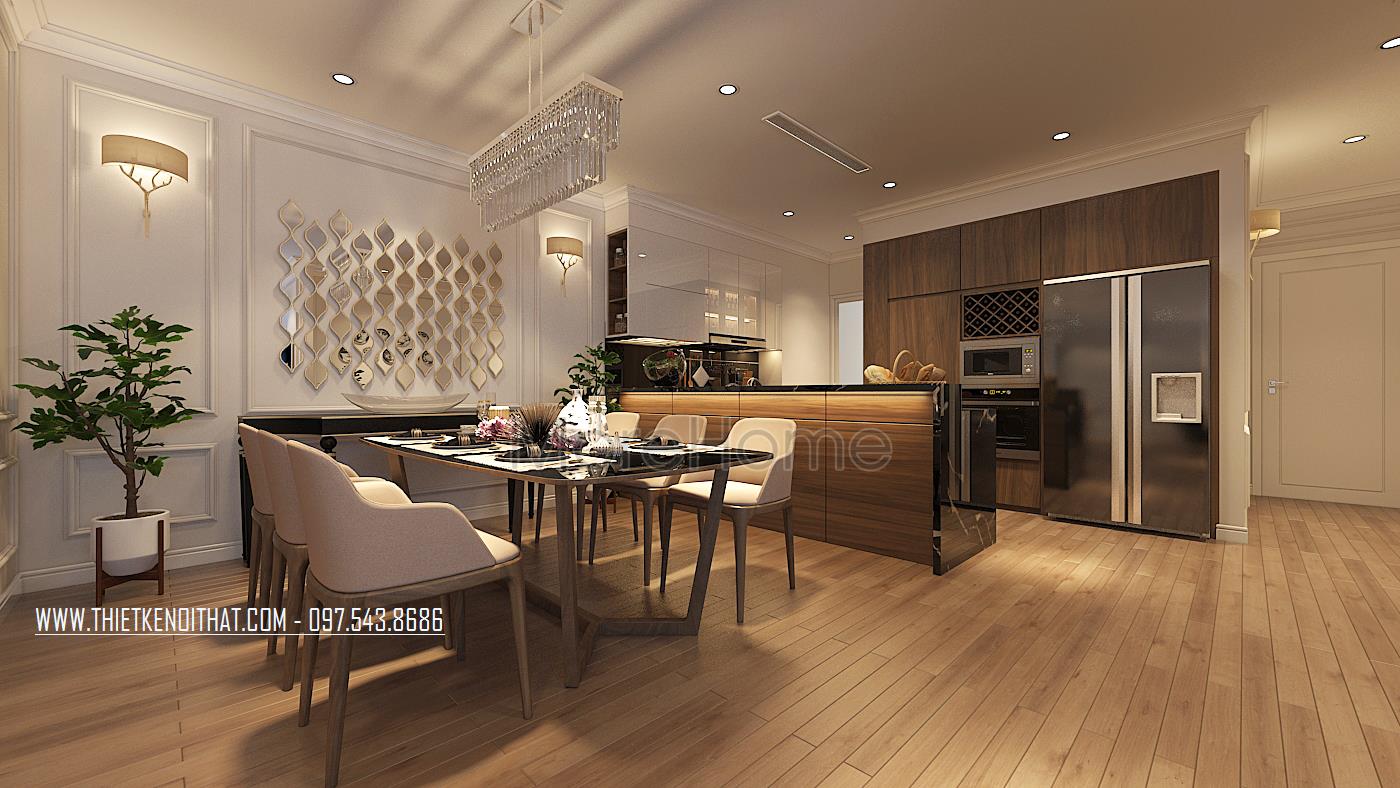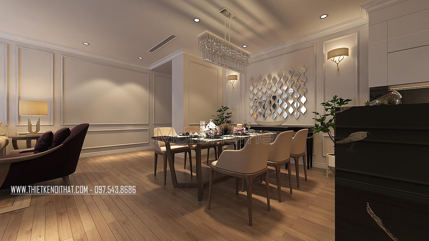 Cạnh khu bếp là bộ bàn ghế ăn, được thiết kế với 6 chiếc ghế grace có tay bọc nỉ. Bộ bàn ghế ăn được đặt ở vị trí trung tâm của không gian, đèn bàn ăn được KTS sử dụng đèn pha lê rất sang trọng và phù hợp với phong cách tân toàn căn hộ. Bộ bàn ăn cùng với vách gương trang trí tạo nên một điểm rất bắt mắt trong ngôi nhà.