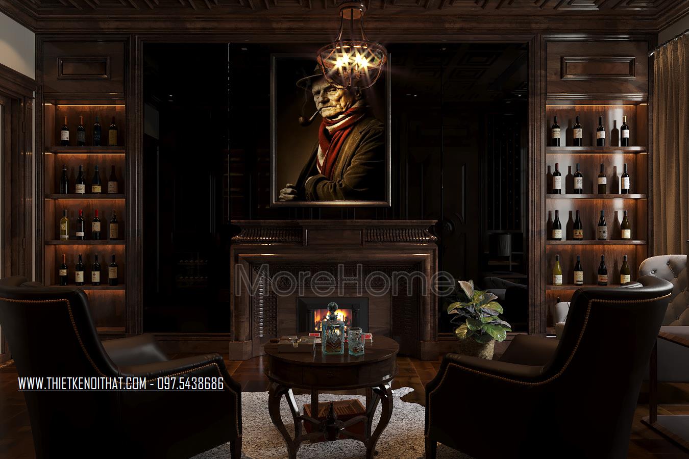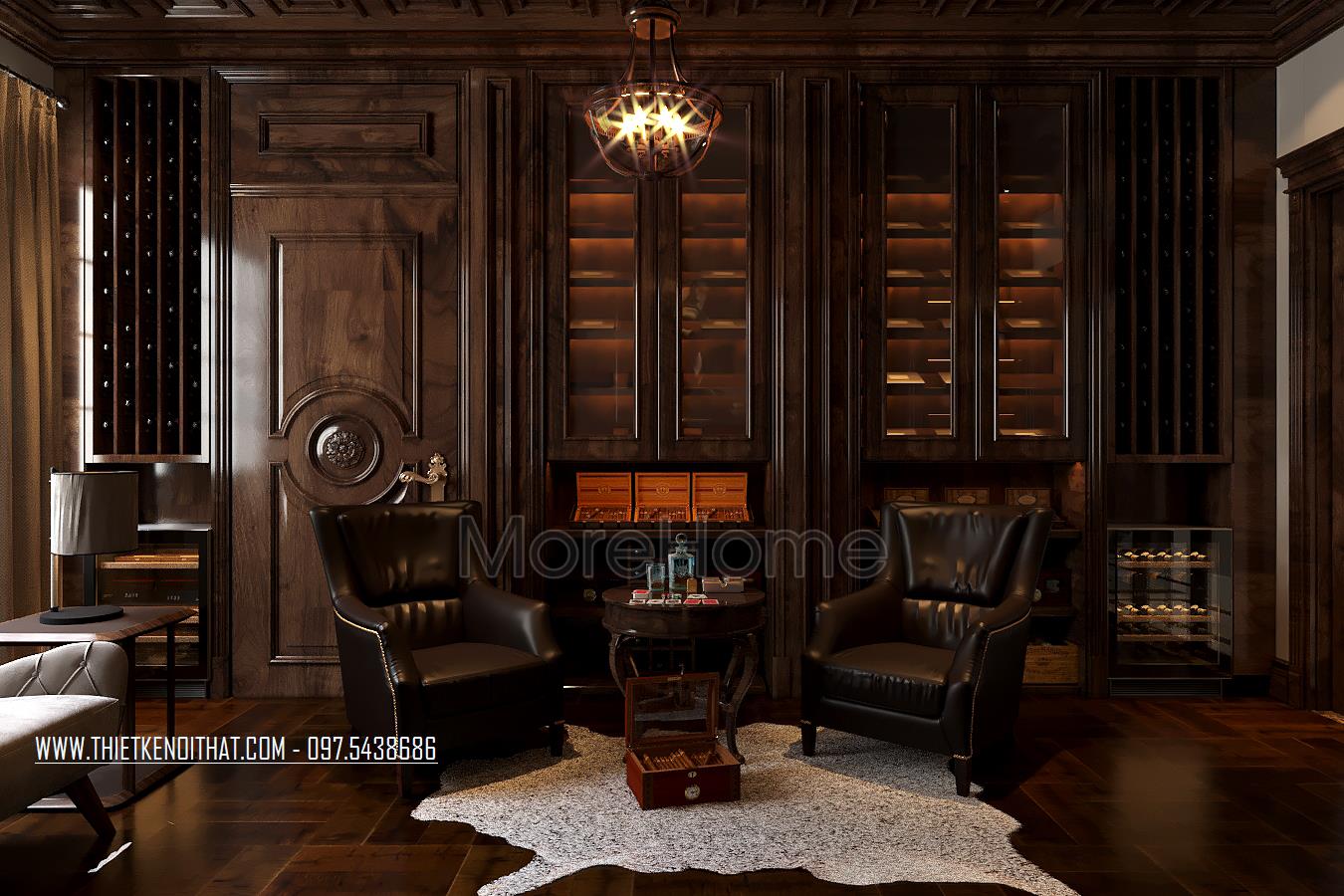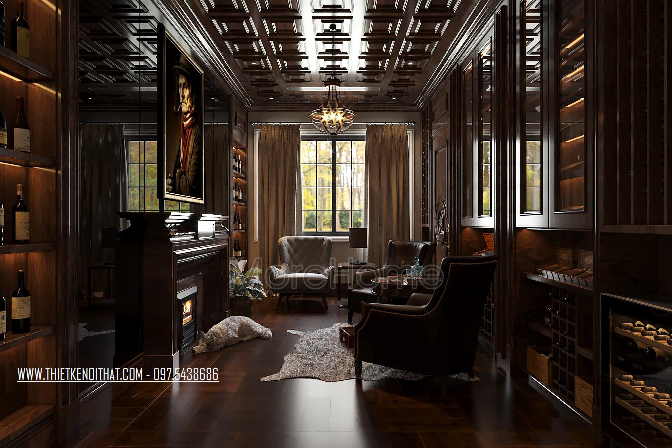 Đẳng cấp hơn nữa KTS đã đáp ứng được sở thích của gia chủ với phòng rượu cao cấp. Phòng rượu được thiết kế với gam màu khá trầm ấm với chất liệu gỗ tự nhiên.