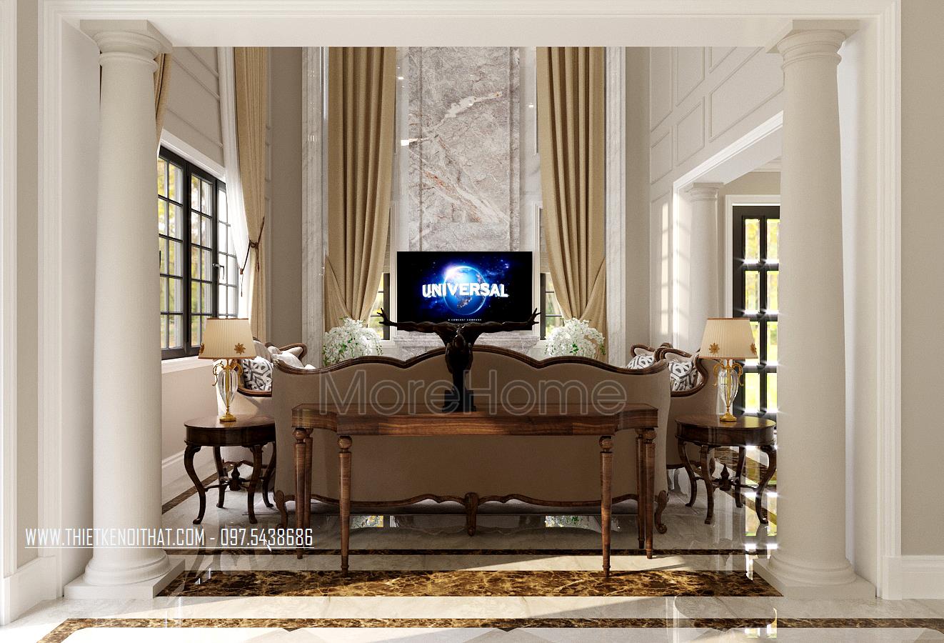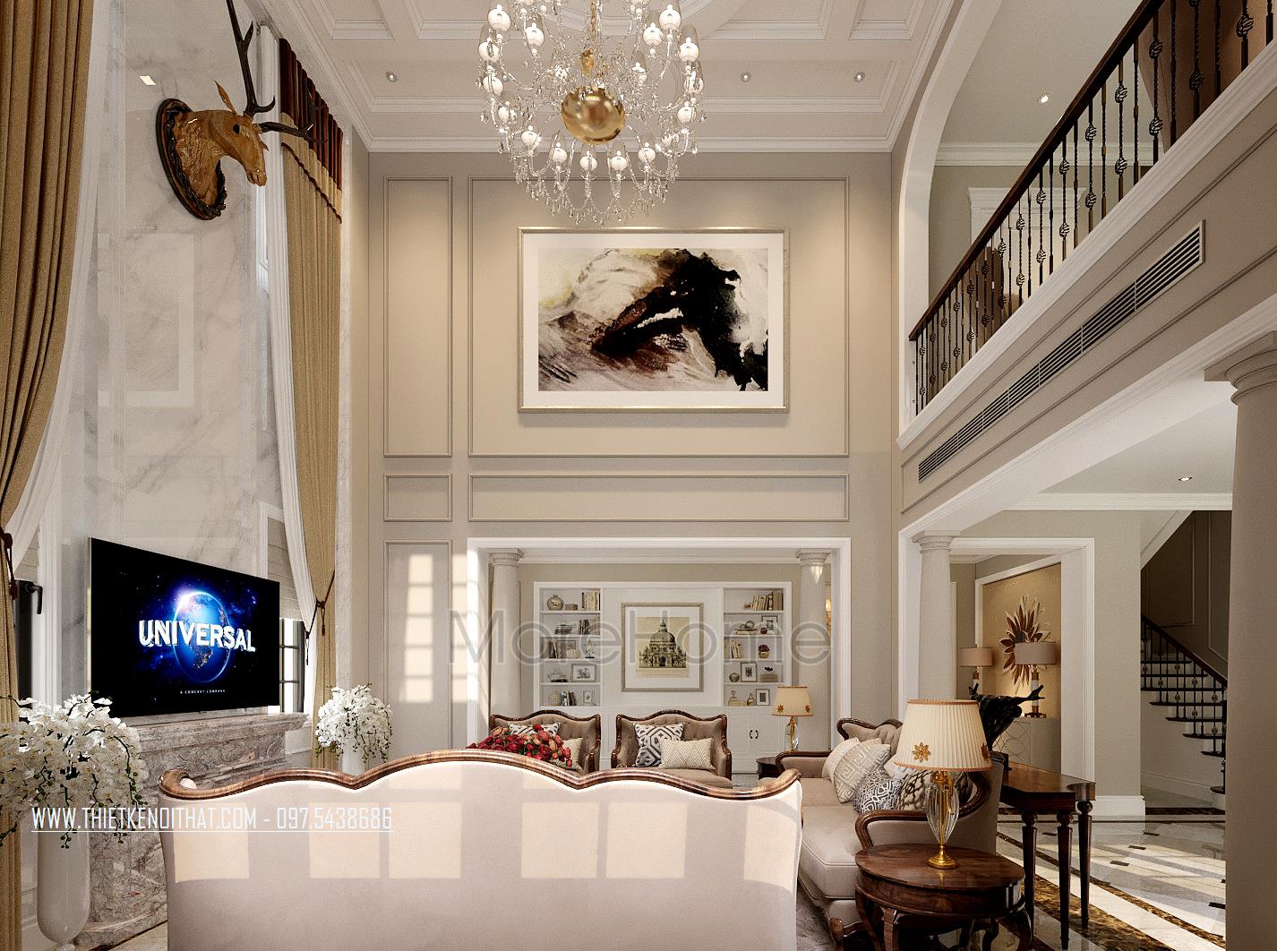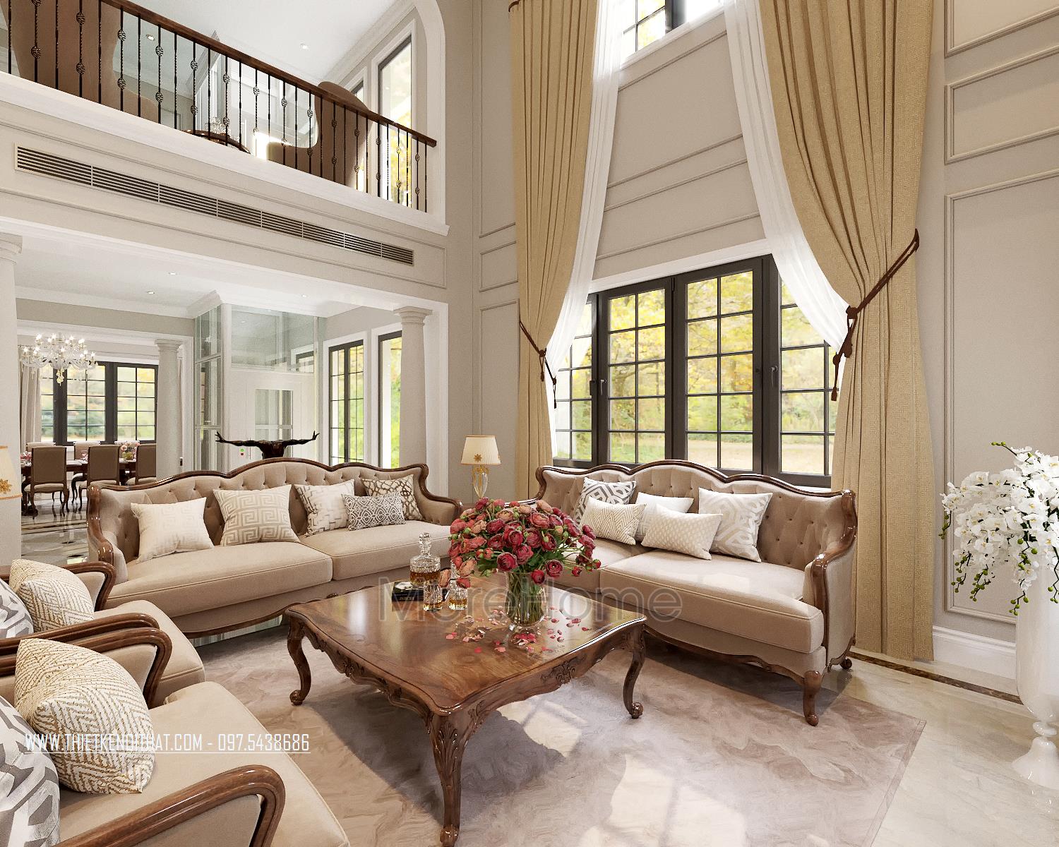 Thiết kế nội thất phòng khách tân cổ điển cao cấp với bộ sofa nỉ gỗ óc chó cao cấp màu sữa tạo nên một không gian phòng khách đồ sộ trước mặt người nhìn. Phòng khách được trang trí với chiếc đèn chùm cao cấp, tab bên cạnh bộ sofa tạo nên không gian tiện nghi sang trọng.