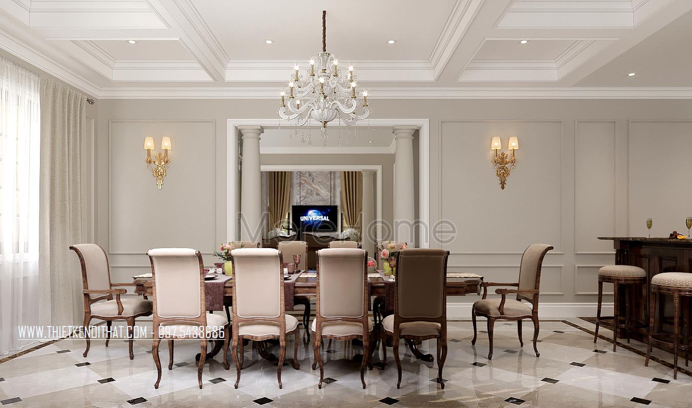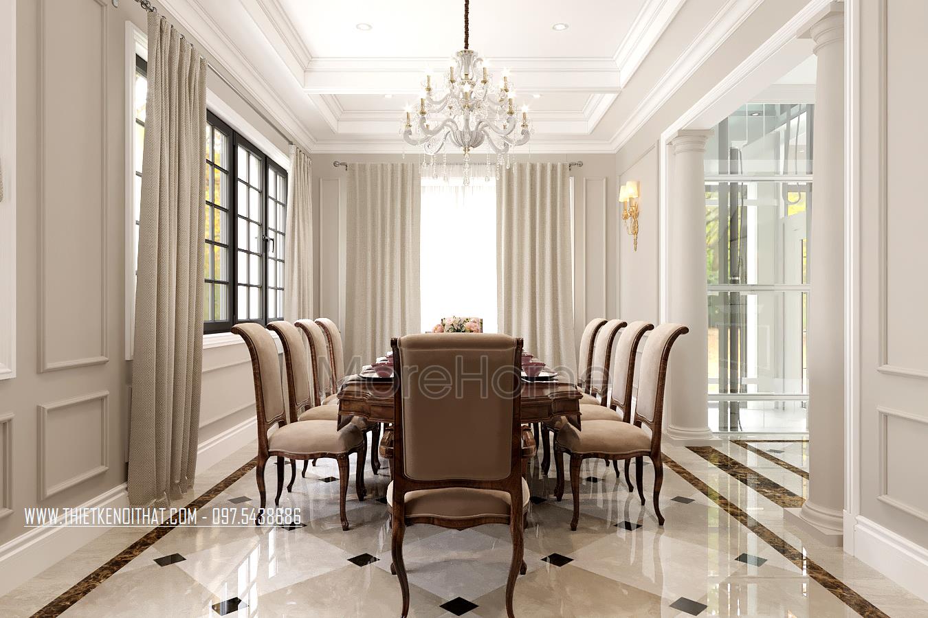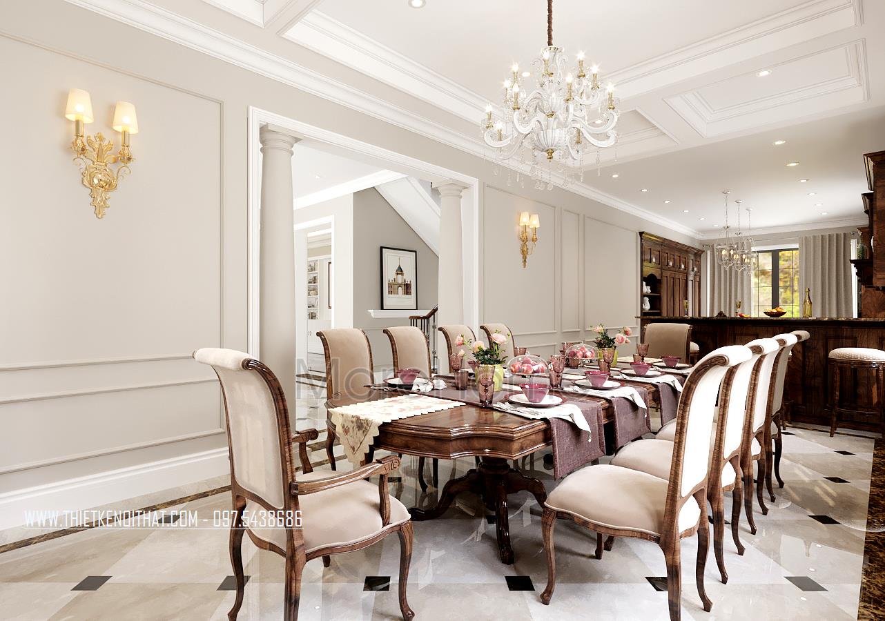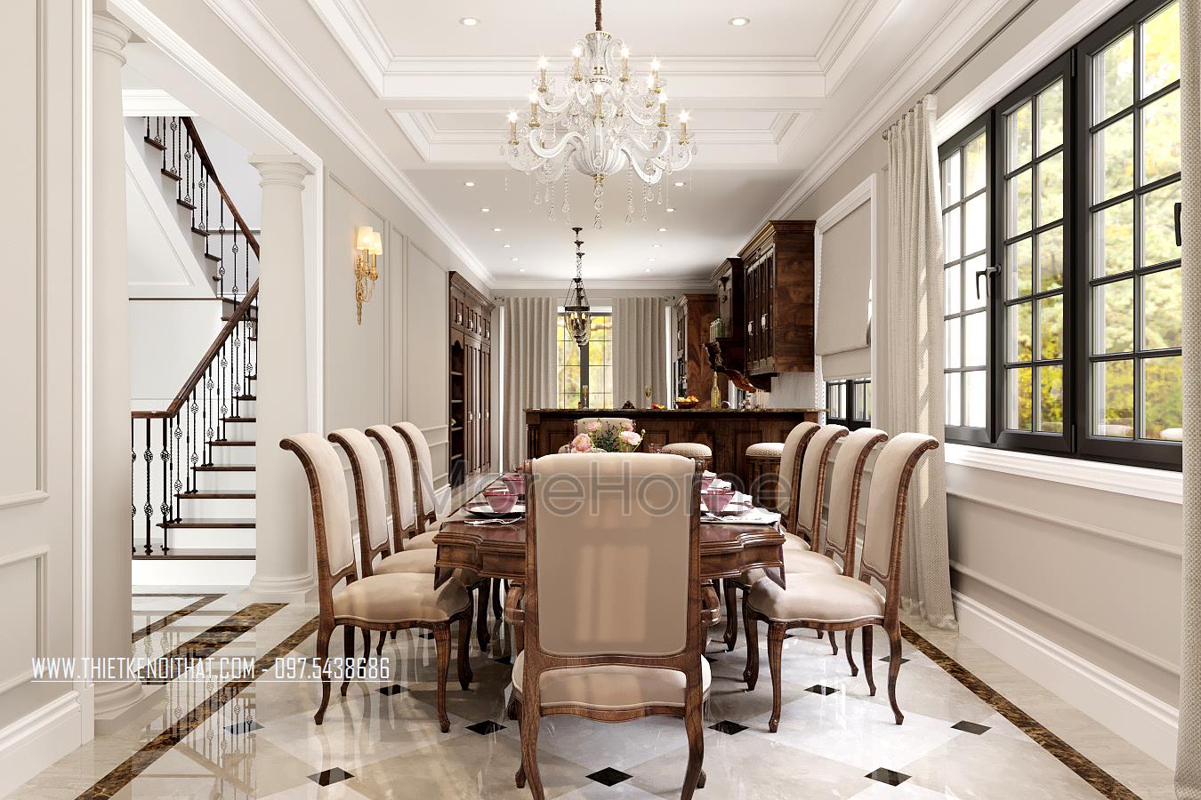 Phía bên tay phải là không gian ăn uống, nội trợ của căn biệt thự. Với bộ bàn ăn 10 người phong cách tân cổ điển, chất liệu nỉ kết hợp gỗ óc chó của bộ bàn ăn tạo nên không gian ăn uống mang phong cách hoàng gia.
