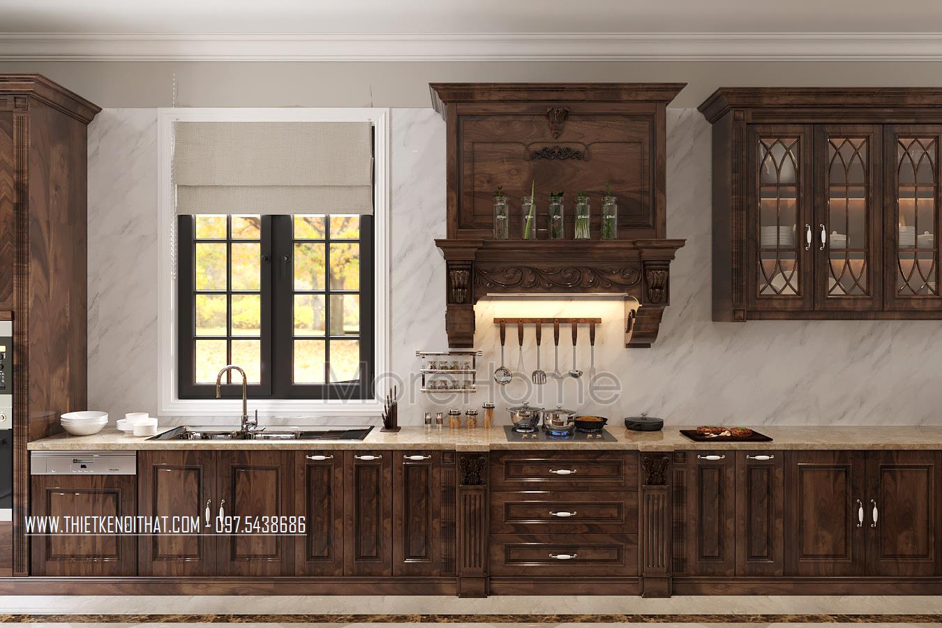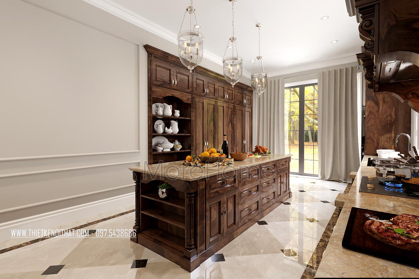 Tiếp đến cùng khu vực này là không gian bếp trải dài. Được KTS thiết kế với bộ tủ bếp cao cấp kéo dài hết chiều dài còn lại của căn phòng. Với chất liệu gỗ óc chó mẫu tủ bếp mang đến một ánh nhìn đồ sộ cho người dùng. Không phải là mẫu tủ bếp bình thường mà đây là mẫu tủ bếp khá đa năng với 2 dãy tủ 2 bên, một bên là là tủ bếp với không gian nấu nướng, một bên tủ bếp để đồ dùng như bát đĩa, nồi,.. Ở giữa là chiếc đảo bếp tiện nghi cho việc đặt đồ ăn và kiểm soát đồ ăn trước khi được dọn ra bàn ăn.