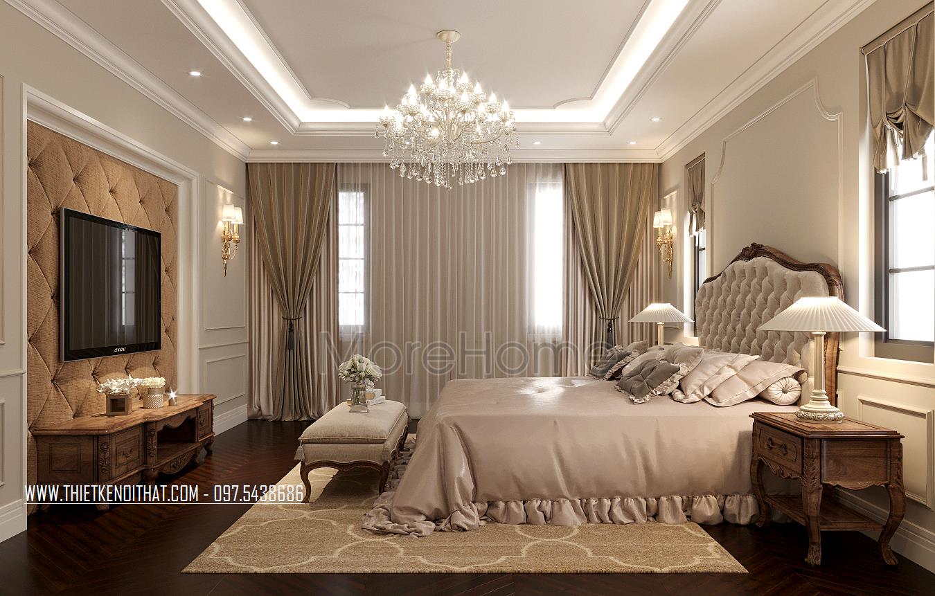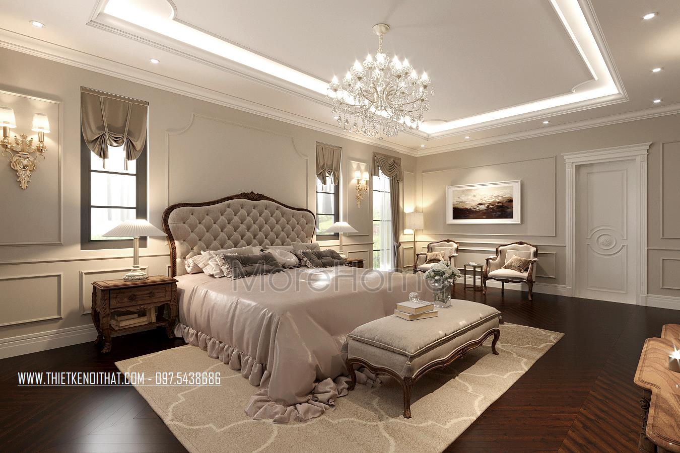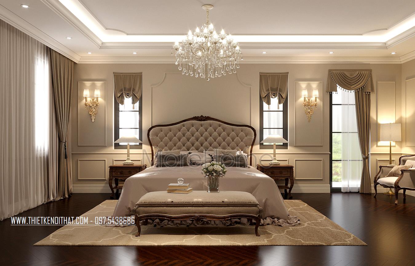 Bước lên tầng 2 là khu vực nghỉ ngơi cho mọi thành viên trong gia đình. Mẫu phòng ngủ tân cổ điển được thiết kế với những chiếc giường có đường nét uốn lượn kết hợp với màu trắng sữa tạo nên không gian sang trọng, lộng lẫy. Trong phòng ngủ được KTS đã trang trí thêm 2 chiếc đôn sofa cao cấp giúp cho gia chủ ngồi đọc sách xem tivi trước khi đi ngủ. Điểm mới lạ nữa trong căn phòng này là vách nỉ ốp tường của mảng tường đối diện với chiếc giường tạo nên sự tinh tế, ấm áp hơn cho căn phòng.