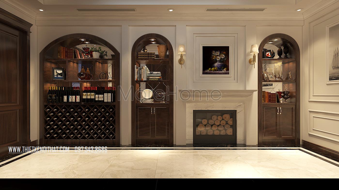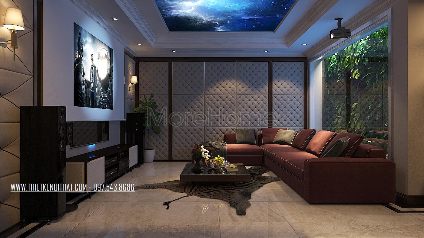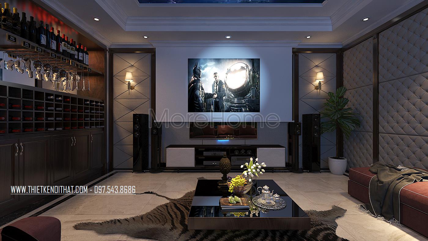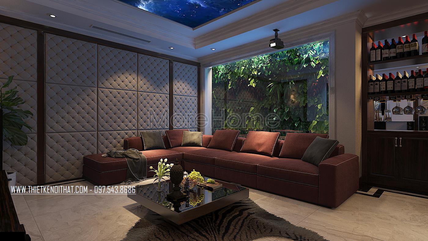 Tầng hầm của căn biệt thự được thiết kế với không gian phòng rượu kết hợp phòng karaoke cao cấp. Ở đây, KTS đã thiết kế với bộ sofa chữ L bằng nỉ màu đỏ mận cao cấp kết hợp với hệ tủ rượu đa năng giúp gia chủ trưng bày rượu một cách sang trọng và tinh tế nhất. Một chiếc tivi lớn cùng với hệ loa đài âm thanh tạo nên không gian giải trí thật tiện nghi. Mảng tường cao cấp được ốp bằng nệm sofa giúp cho việc cách âm tối đa nhất.