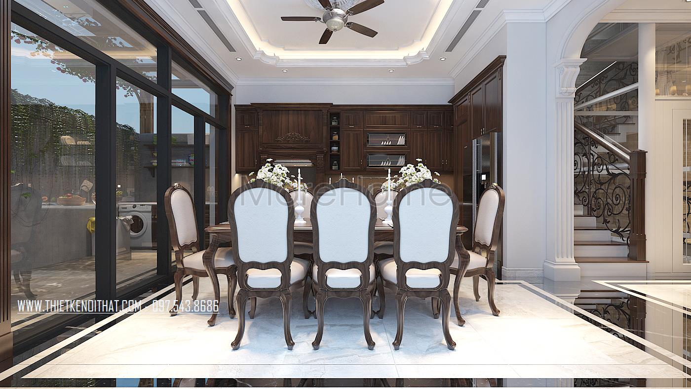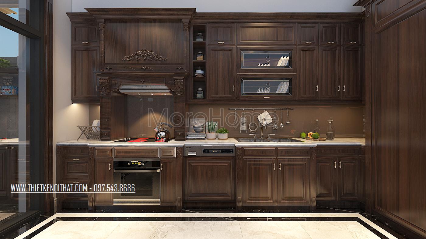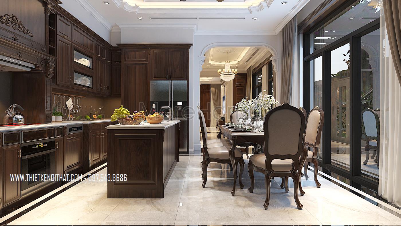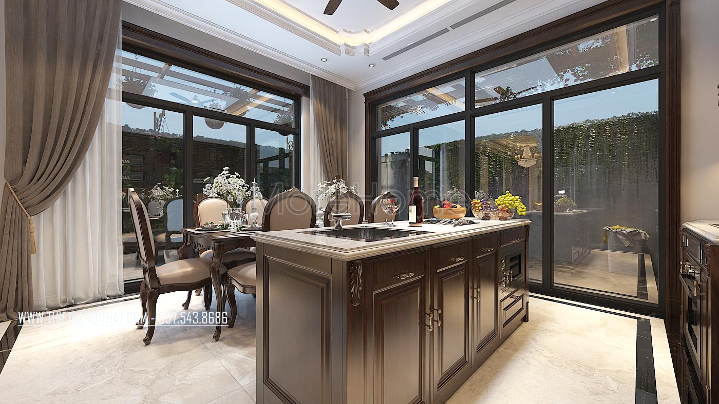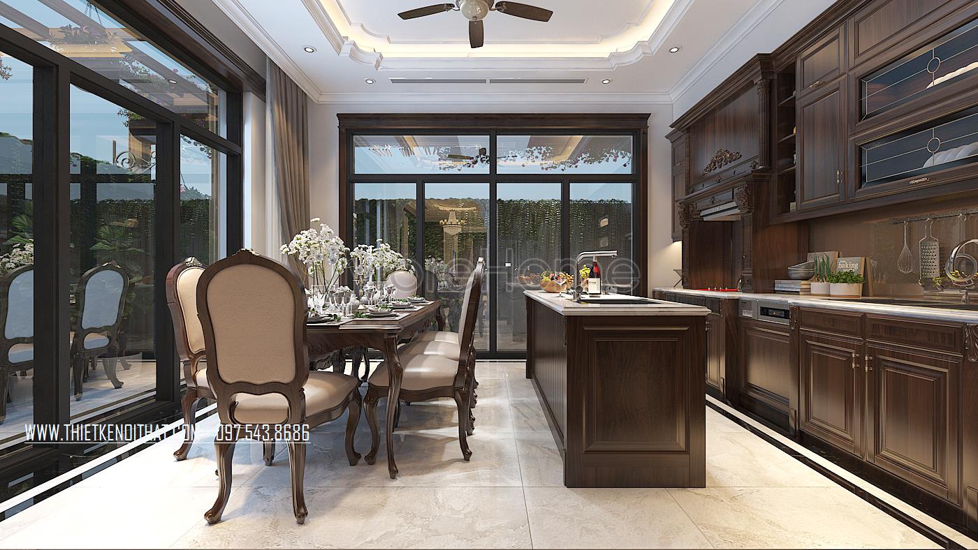 Thiết kế phòng bếp kết hợp phòng ăn cao cấp với chất liệu gỗ tự nhiên. Không gian bếp đa năng với tủ bếp gỗ tự nhiên chắc chắn, an toàn cùng với chiếc đảo bếp ngăn cách giữa không gian bếp và bàn ăn.