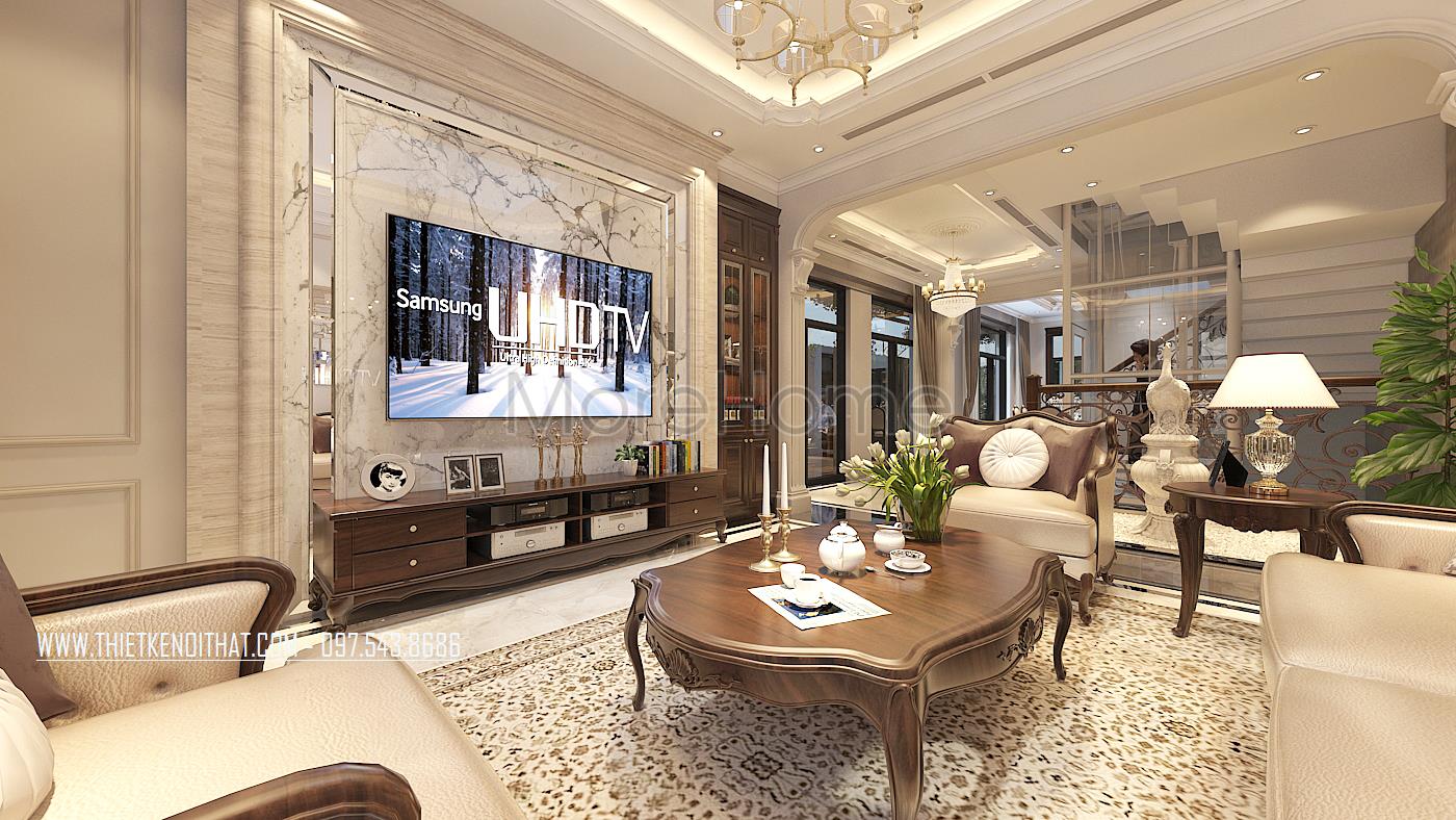 Bước đến phòng khách tân cổ điển, vẫn mẫu sofa gỗ cao cấp ấy nhưng chất liệu nệm là da cao cấp tạo không gian phòng khách đẳng cấp hơn bao giờ hết. Mảng tường phía sau chiếc sofa được trang trí với mẫu gương ghép ốp tường hiện đại, mới lạ tạo cho căn phòng thêm sang trọng và tinh tế. Đối điện với bộ sofa là mảng tường được đặt chiếc tivi màn hình phẳng cùng với chiếc kệ tivi bằng gỗ tự nhiên màu trầm tạo nên sự tiện nghi cho gia chủ.