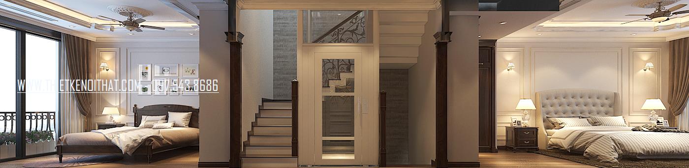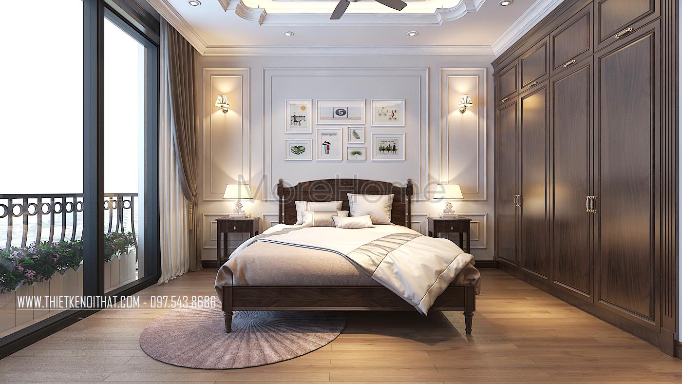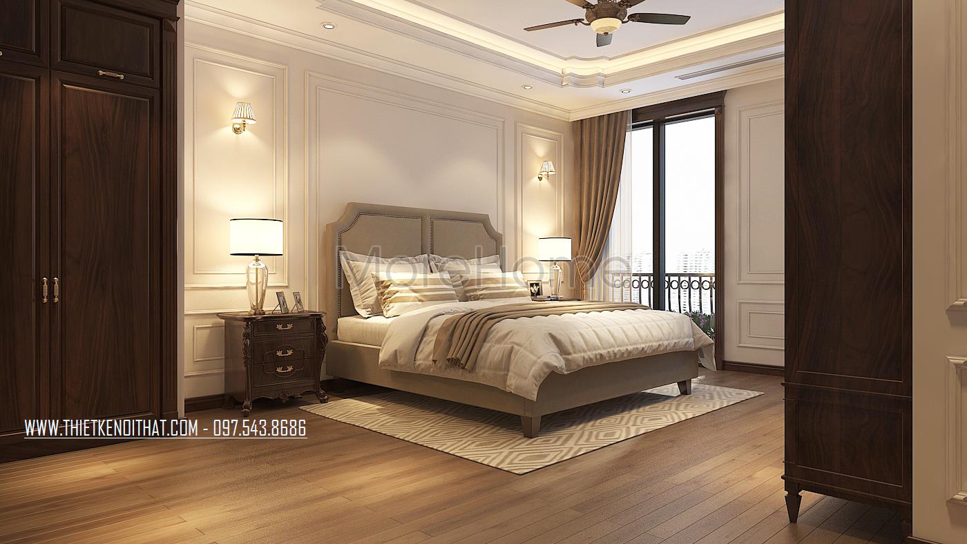 Tầng 2 căn biệt thự là không gian nghỉ ngơi của gia chủ. Phòng ngủ được thiết kế khá hiện đại và tiện nghi với đồ nội thất bằng gỗ. chiếc giường gỗ đơn giản với gỗ tự nhiên tạo sự chắc chắn an toàn khi ngủ. Hệ tủ sách và bàn làm việc được thiết kế kéo dài tạo sự tiện nghi cho gia chủ. Tủ áo được thiết kế với hệ của mở thật chắc chắn và đa năng.