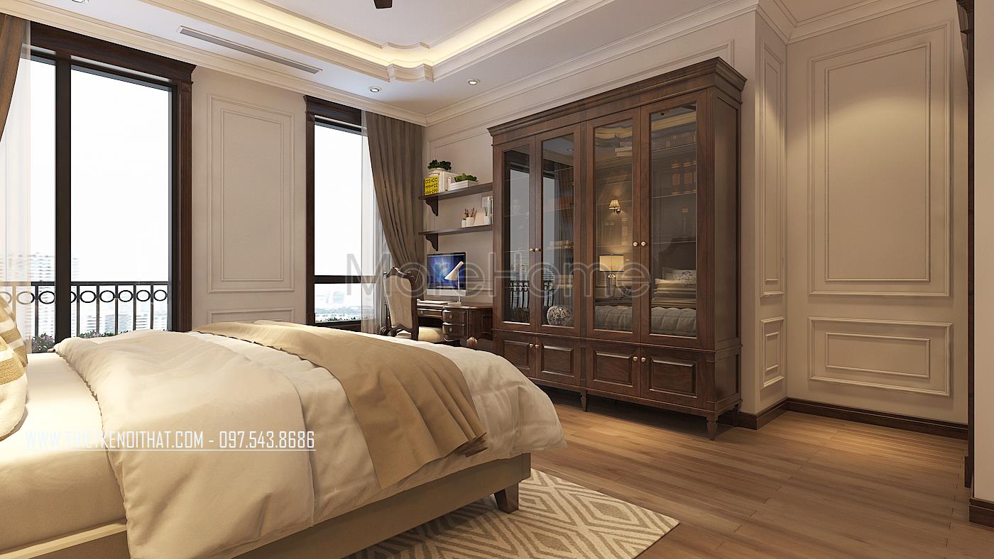 Phòng ngủ thứ 2 được thiết kế sang trọng hơn với với đầu giường khung gỗ bọc nỉ cao cấp. Bàn trang điểm được thiết kế cổ điển giúp cho gia chủ có được không gian làm đẹp tuyệt vời nhất.