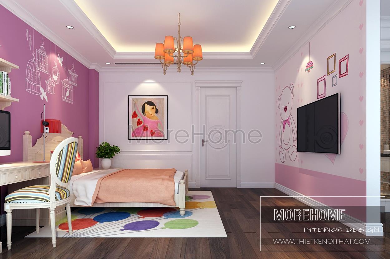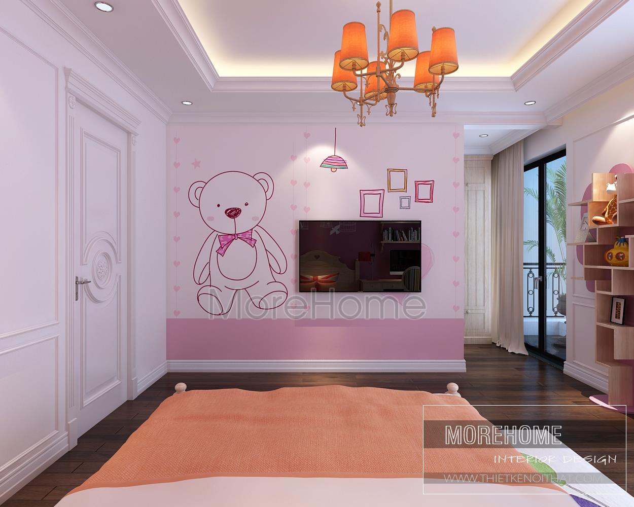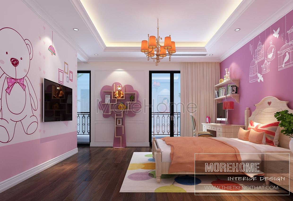 Phòng ngủ con gái được thiết kế đáng yêu, ngộ ngĩnh với màu sắc và họa tiết giấy dán tường. Màu hồng đậm là màu chủ đạo của không gian phòng ngủ này, kết hợp với màu cam của ga giường và của chiếc đèn trần tạo nên không gian phòng ngủ của bé thêm sinh động. Hệ thống kệ sách cũng được thiết kế ngộ ngĩnh đáng yêu với hình thù khác nhau.