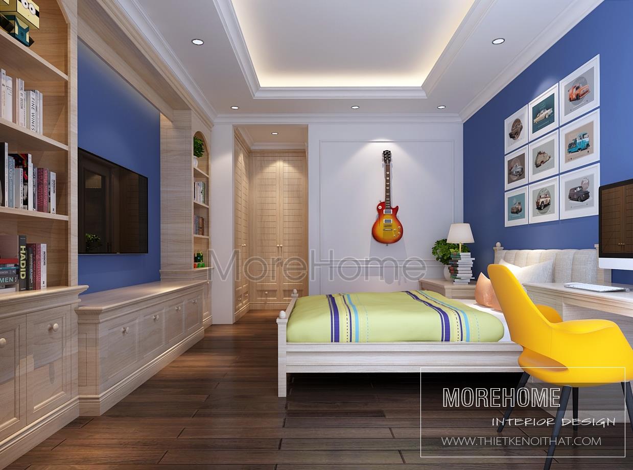 Thiết kế phòng ngủ bé trai năng động, sáng tạo hơn với màu xanh và họa tiết trang trí. Phòng ngủ bé trai luôn có hệ thống kệ sách lớn vì con trai luôn có những lý tưởng sống rộng hơn con gái.