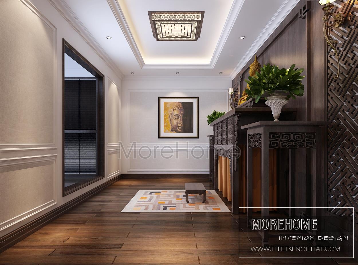 Thiết kế phòng thờ cao cấp với mẫu bàn thờ và hệ vách ốp tường bằng gỗ tự nhiên. Đây là không gian thờ cúng chu toàn và đầy đủ nhất mà gia chủ muốn dành cho người đã khuất.