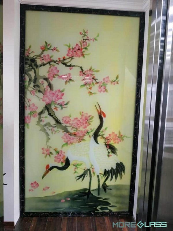 . Để giúp bạn có một phòng khách đẹp, mẫu vách kính được khắc 3D có hình ảnh hai chim công để mang lại sự may mắn và thịnh vượng cho gia chủ.