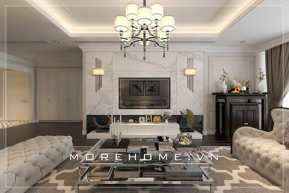 Bố trí nội thất phòng khách tân cổ điển sang trọng, đường nét hoa văn chạm khắc tinh tế tạo nên không gian căn phòng